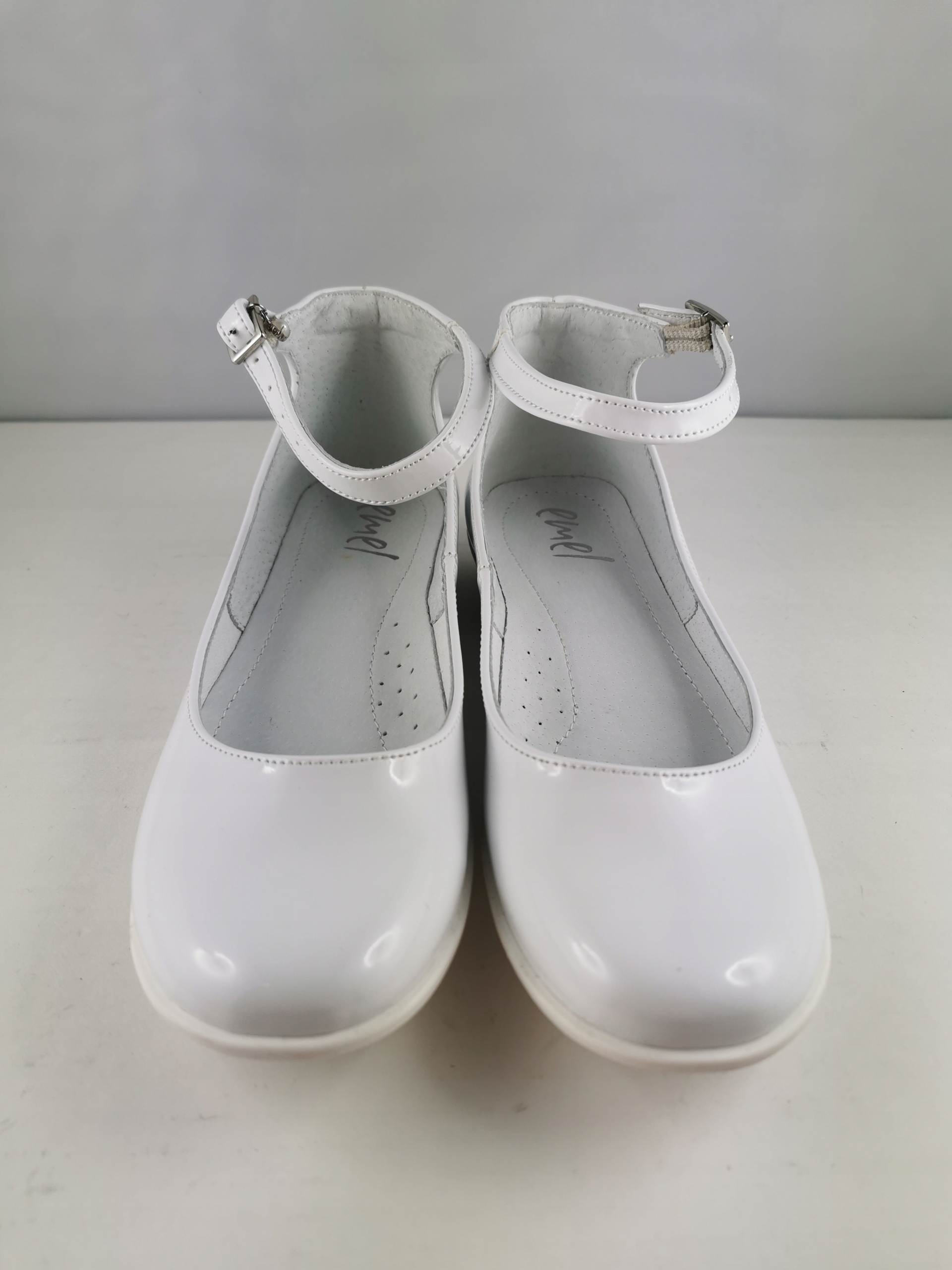 Классический крой с необычным дополнением. Эта модель отличается комфортом и неподвластным времени очарованием. Дополнительно имеется ремешок с пряжкой, который удерживает ногу. В таких туфлях каждая девушка сможет уверенно пойти не только к Святому Причастию, но и на рождественский ужин или свадьбу. В них оно будет сиять!