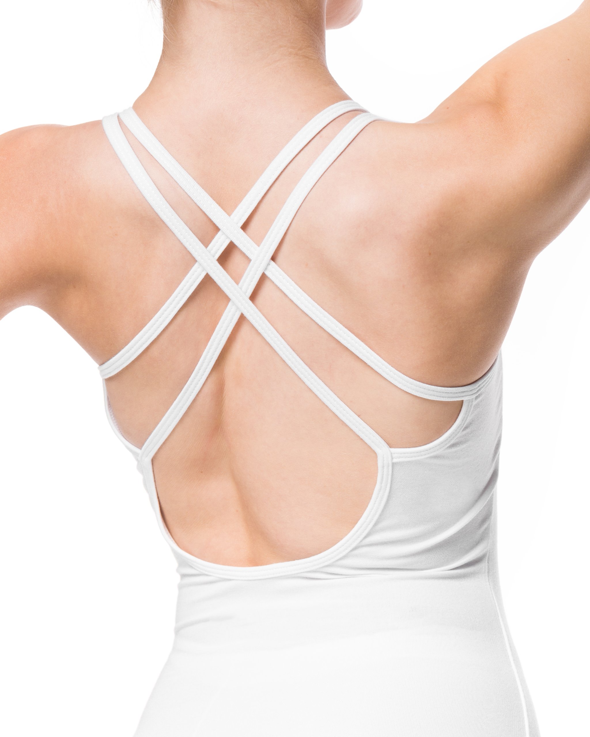 Удобное боди со скрещенными бретелями на спине, что придает эффектный вид. Костюм идеально подходит для занятий балетом и гимнастикой.