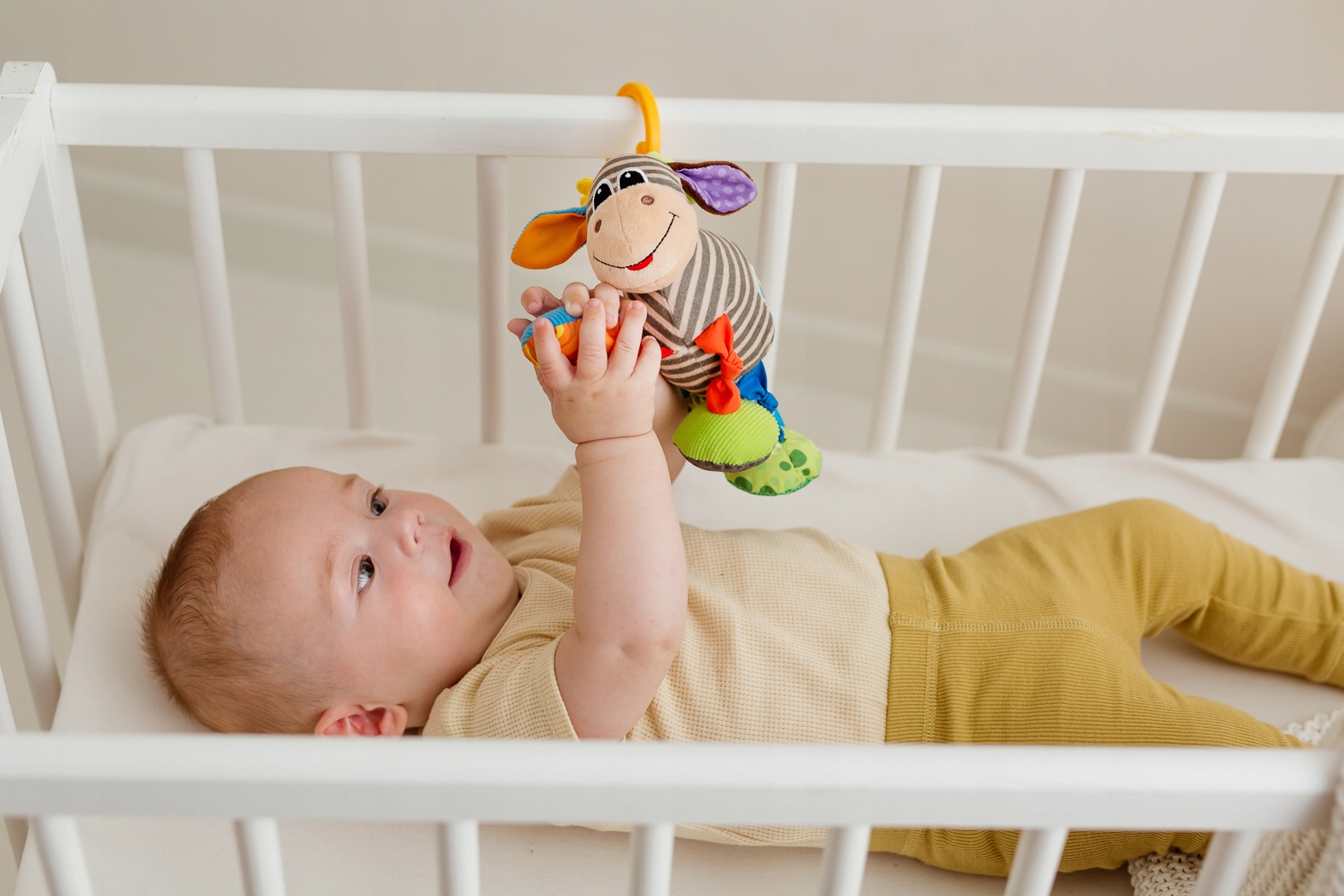 Алек — лось для особых задач. Он развлекает малыша, весело «машет» ножками, даёт тактильные стимулы, тем самым развивая познавательные способности ребёнка, и даже вибрирует!