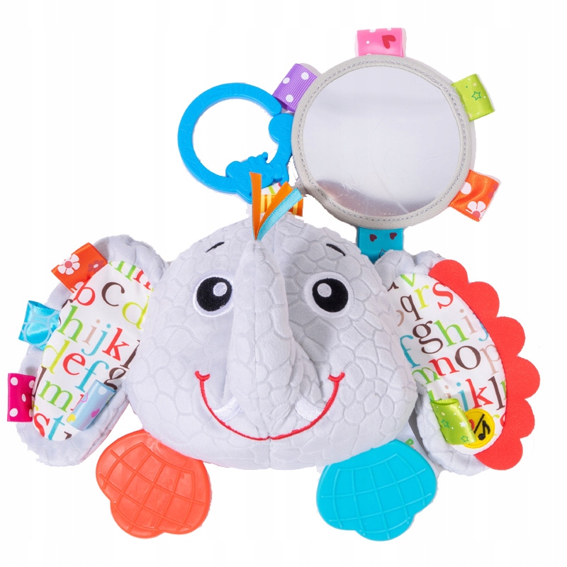 А что за веселый парень присоединился к семейке мягких игрушек? Это музыкальный слон, который доставит детям массу удовольствия, а когда придет время вздремнуть, усыпит их красивыми мелодиями. Музыка запускается при нажатии кнопки, спрятанной в ухе слона. Мы можем выбрать одну из двух мелодий, которую можно переключать, повторно нажав кнопку. Когда звук не нужен, мы можем его отключить, экономя батарейки. Для этого достаточно долго удерживать кнопку. Игрушка изготовлена из различных материалов, которые стимулируют зрение и осязание малыша. Голова слона, украшенная яркими бирками и прорезывателями, и прикрепленное к ней большое безопасное зеркало помогут ребенку в самопознании!
