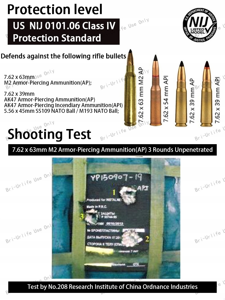 Высший уровень рейтингов NIJ, уровень IV, выдерживает воздействие бронебойной винтовки калибра до .30.