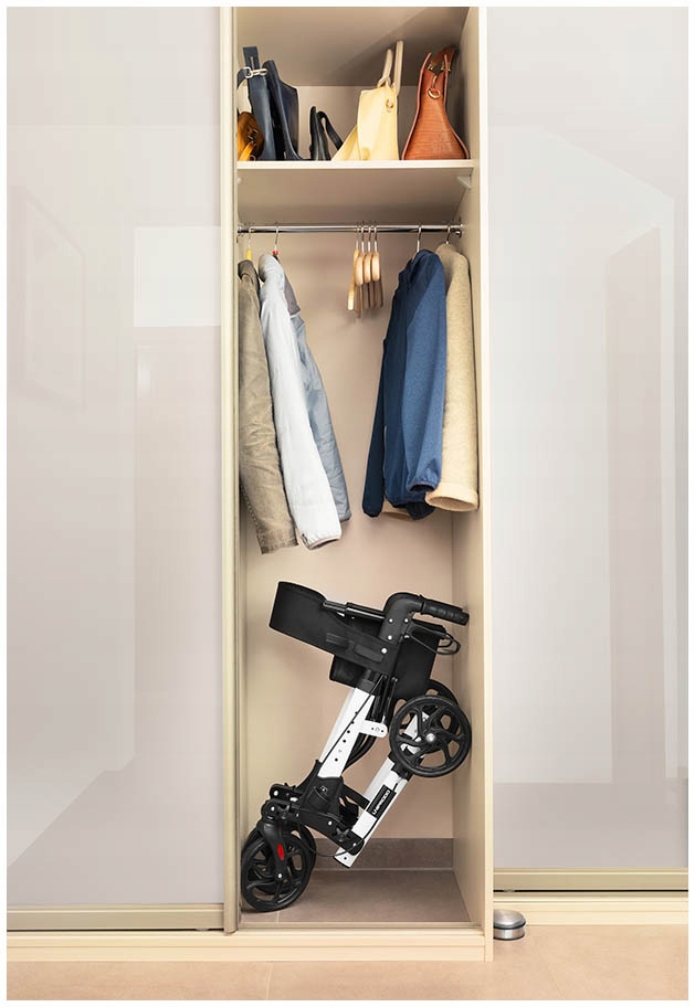 Оснащенный четырьмя колесами TPR диаметром 203 мм, каждый ходунок легко преодолевает неровности местности даже в неблагоприятную погоду. Алюминий, из которого изготовлены ходунки, обеспечивает конструкции высокую прочность и устойчивость. К тому же она легкая, поэтому коляской легко маневрировать. Поворотные передние колеса делают его более маневренным. Если ходунки вам не нужны, их можно быстро сложить благодаря двухэтапному механизму. Он не занимает много места и его можно хранить, например, в шкафу.