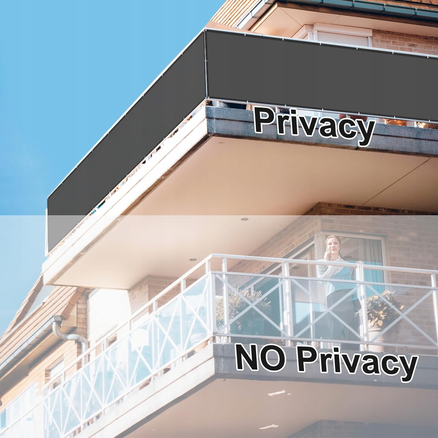 - Крышка балкона изготовлен из полиэтилена с весом 160 г/м². Эта защита зрения может блокировать 90% света и 90% ультрафиолетовых лучей.