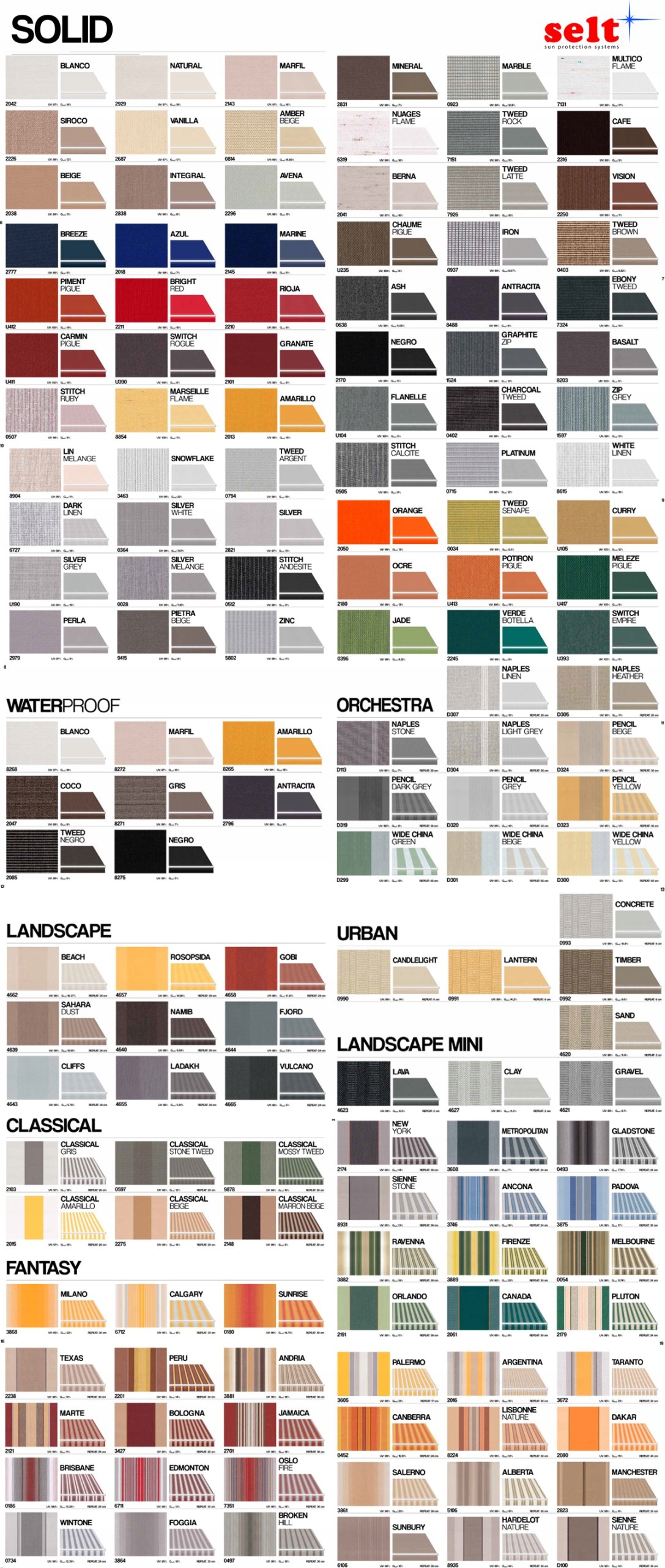 Мы предлагаем вам более 100 различных цветов ткани (в ремнях и одном -колоре). Все ткани являются производством авторитетной европейской компании. Они отличаются долговечностью цветов, высокой сопротивлением световым и погодным условиям, сопротивлением разрыву под воздействием высокого напряжения, воздушной проницаемости с одновременной водостойкостью.