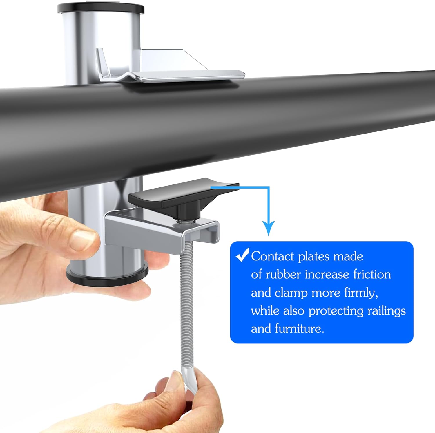 - Легкая сборка: подставка для внешнего зонда может быть легко прикреплена к балюстраде и может быть быстро перемещена без использования инструментов. Зубные винты оснащены резиновыми рукавами, которые защищают балюстраду и делают зонтик более стабильным для использования.