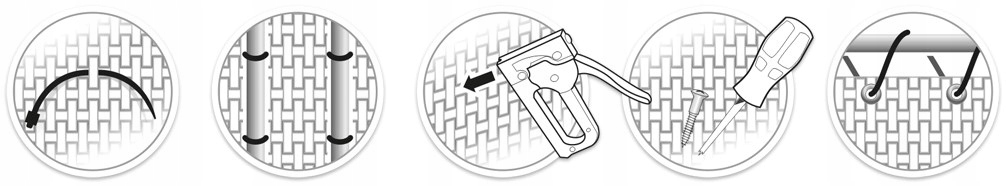Зажимы: ленту следует продеть через крышку, обернуть вокруг перекладины, затем затянуть крышку и отрезать конец ленты. Монтаж с помощью стяжек через каждые 10-15 см по периметру чехла, соблюдая расстояние примерно 6-7 см от края чехла.