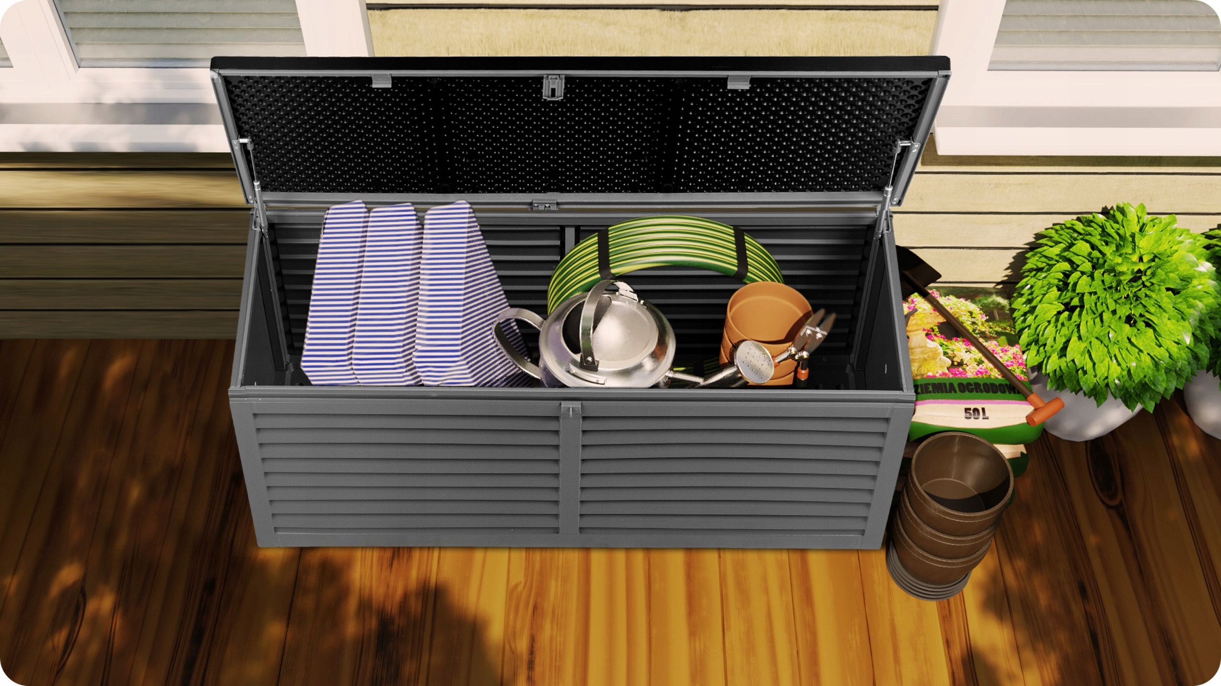 Вместительный садовый ящик позволяет легко хранить необходимые вещи, которыми мы пользуемся каждый день в саду, на балконе и в доме (подушки, матрасы, чехлы, игрушки, инструменты) и многое другое.