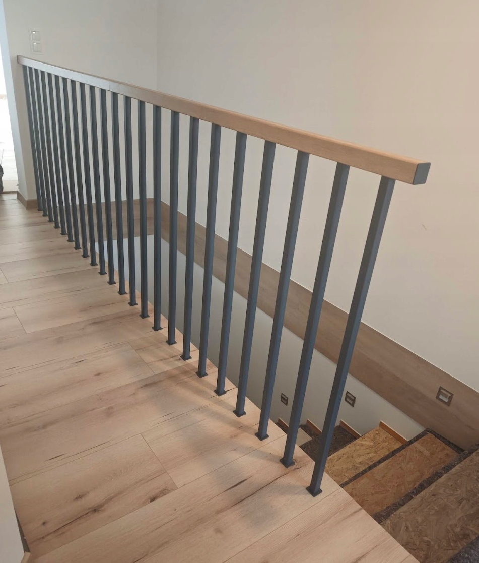 Балустрада, предлагаемая идеально подходит для современных интерьеров в различных стилях. Сочетание дерева с металлической черной фитингом с очень модным и эффективным соединением.