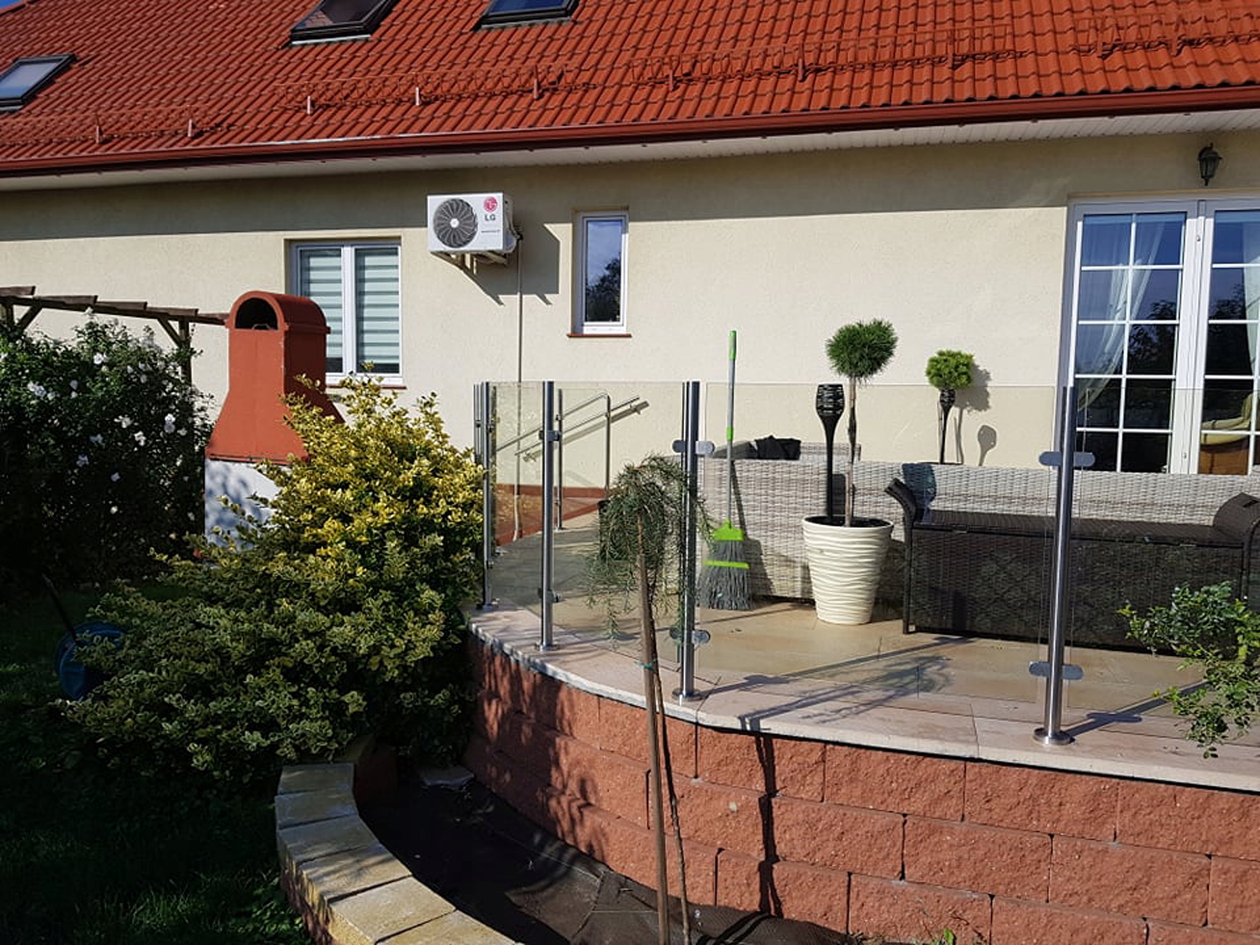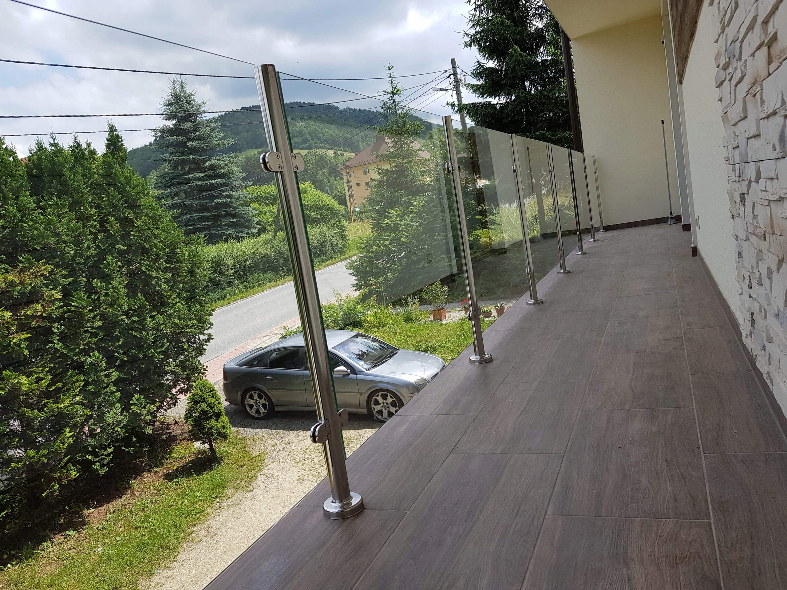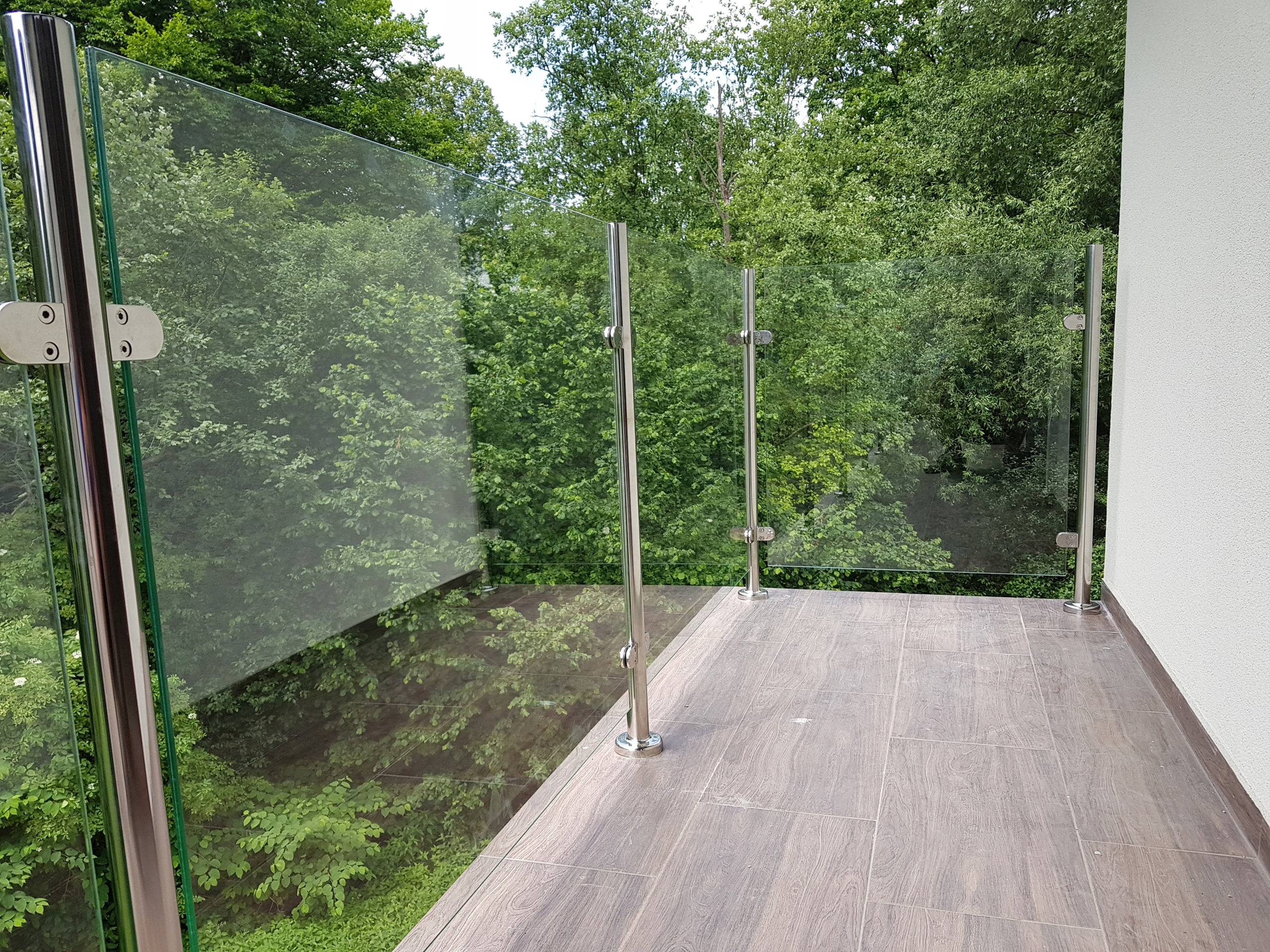 На фотографии ниже показан пример стеклянной балюстрады, установленной на двух стойках из нержавеющей стали.