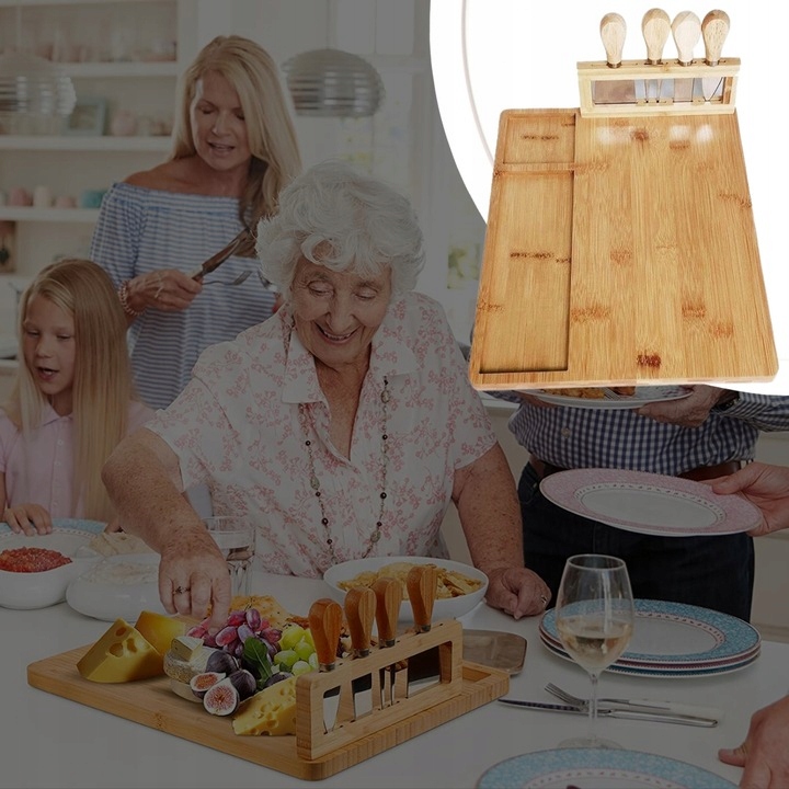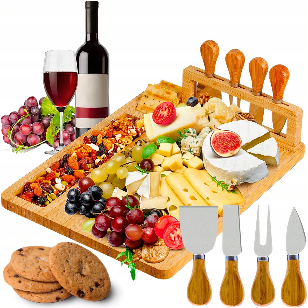 Бамбуковая доска для колбас, сыра и закусок с набором ножей является идеальным выбором для любителей различных вкусов и элегантного стиля. используемый материал, то есть бамбук, характеризуется необычайной долговечностью и сопротивлением механическим повреждениям . Это материал с очень плотной структурой, благодаря которой доска не легко поцарапана или деформации, а его поверхность гладкая и легко чистить