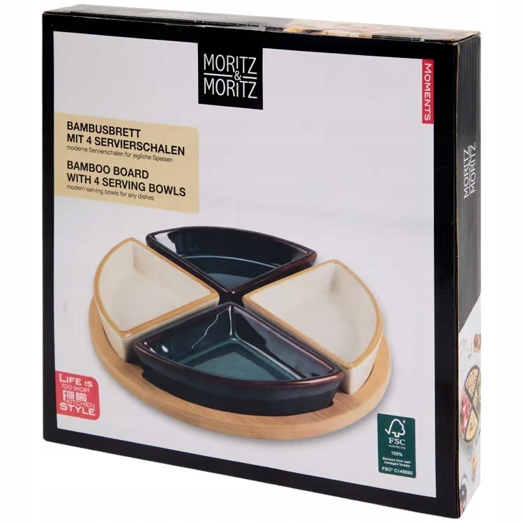 Эта бамбуковая сервировочная доска Moritz & Moritz с 4 контейнерами, пригодными для использования в микроволновой печи, обязательно пригодится на вашей кухне. Идеально подходит для подачи как горячих, так и холодных тапас, а также орехов, оливок, соусов и других закусок. Идеальное решение для вечера с друзьями, романтического ужина или просто побаловать себя чем-нибудь вкусненьким.