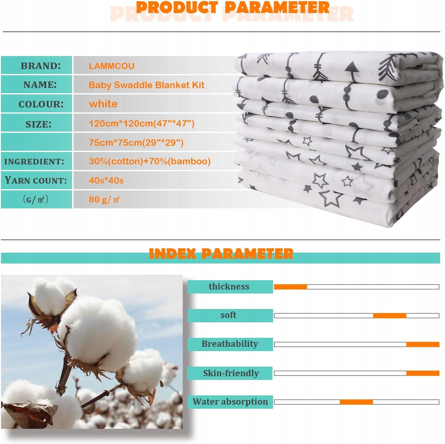 ОБНОВЛЕННЫЙ ПРОЧНЫЙ МАТЕРИАЛ — одеяла Lammcou Baby Sladdle (40S / 250T) 120 (г/м2) Бамбуковая муслиновая ткань, которая является стандартом пряжи самой высокой плотности.