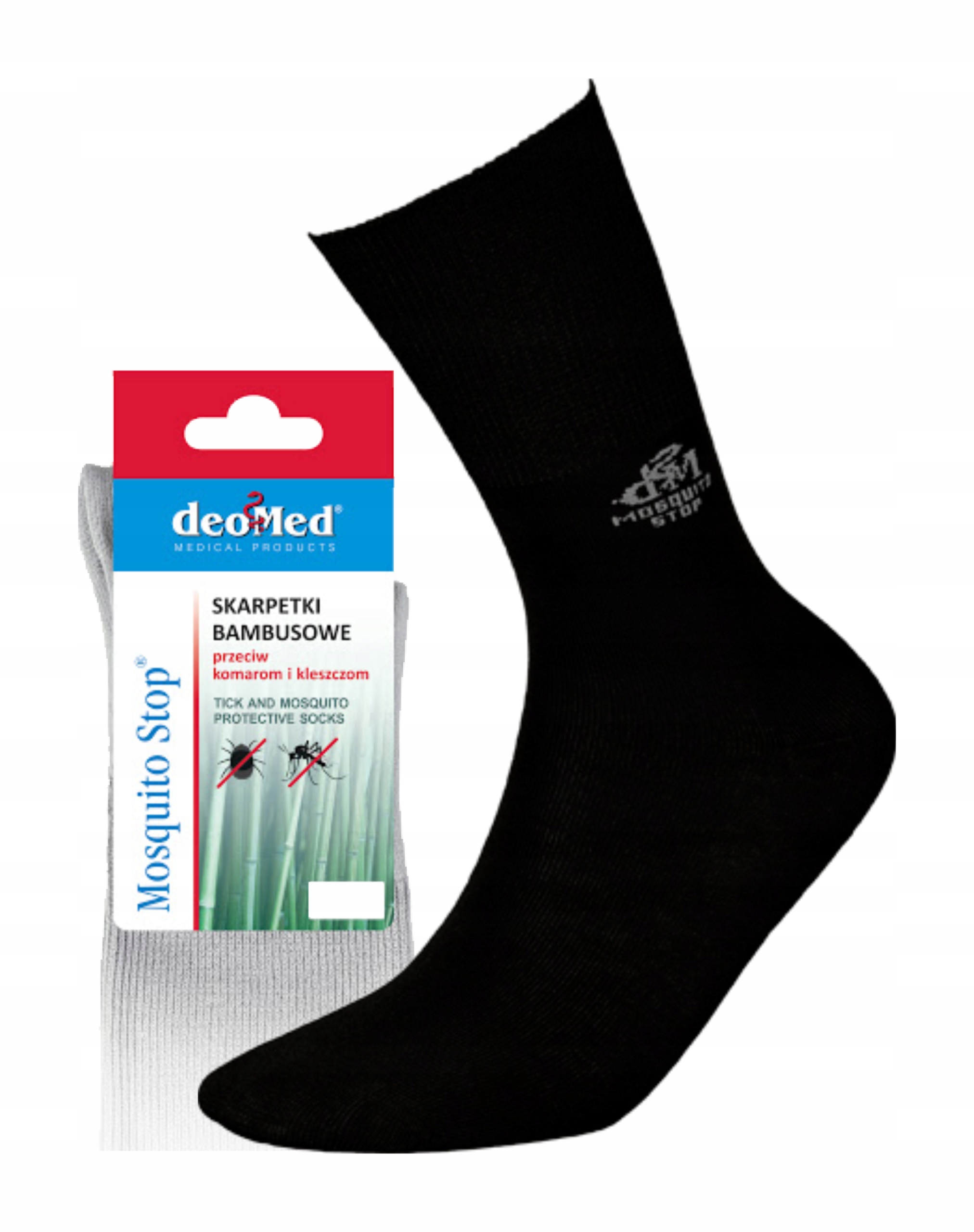 Бамбуковая пряжа Deomed® Mosquito Stop Носки для здоровья – это медицинский продукт высочайшего качества от JJW. Специальная отделка обеспечивает длительное и эффективное действие против клещей, комаров и других кусающих насекомых. Отделка отталкивает насекомых на расстоянии нескольких сантиметров от ткани и снижает количество укусов более чем на 90%. Кроме того, специальная конструкция верха и небольшая примесь эластана по всей носке обеспечивают идеальную, прилегание к ногам без давления и максимальная гибкость - не блокирует кровоток и обеспечивает комфорт даже опухшим ногам.