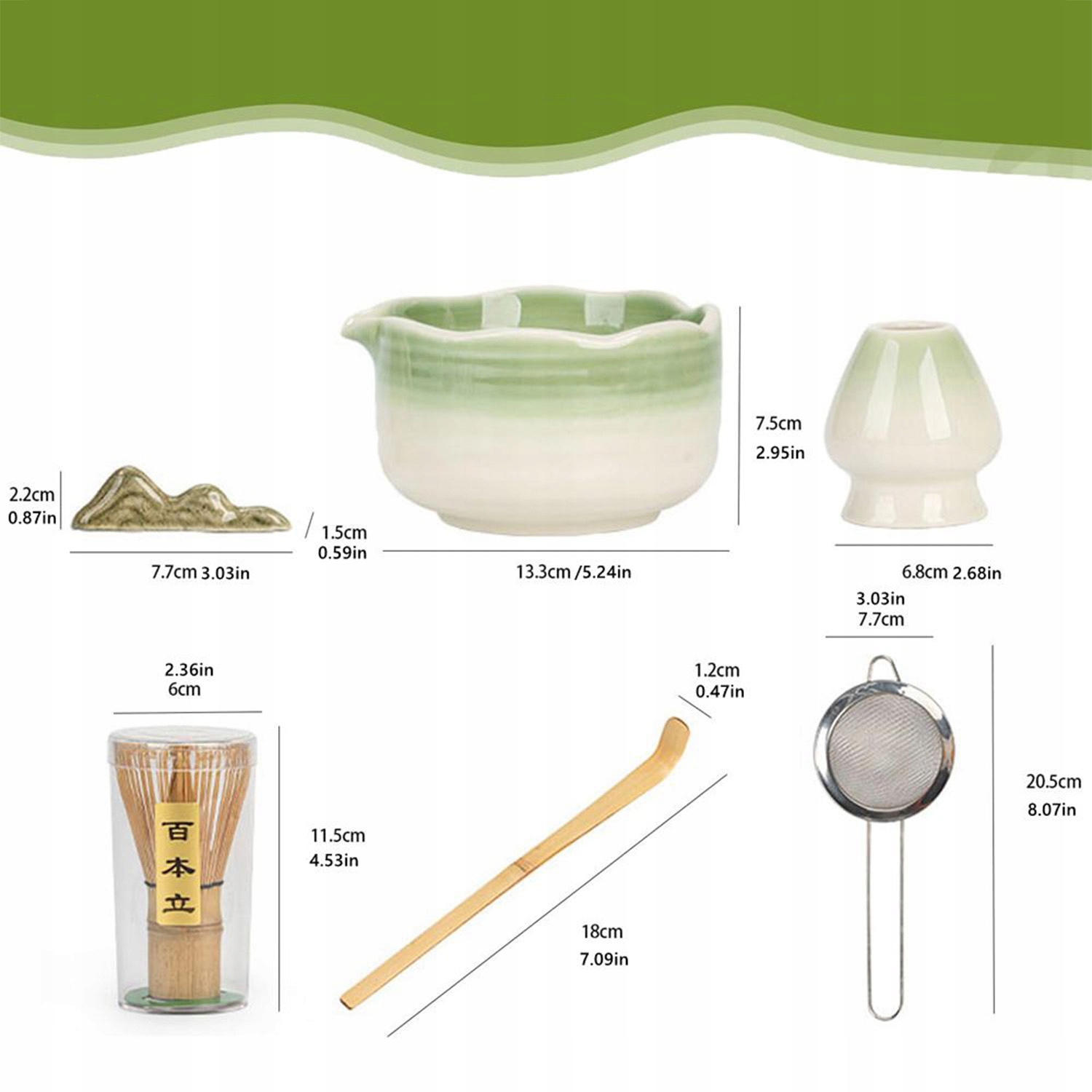 Набор из семи предметов включает в себя чашу для матча, бамбуковую подставку, подставку для венчика, набор для чая, ситечко для матча, держатель для щетки и кухонную тряпку.
