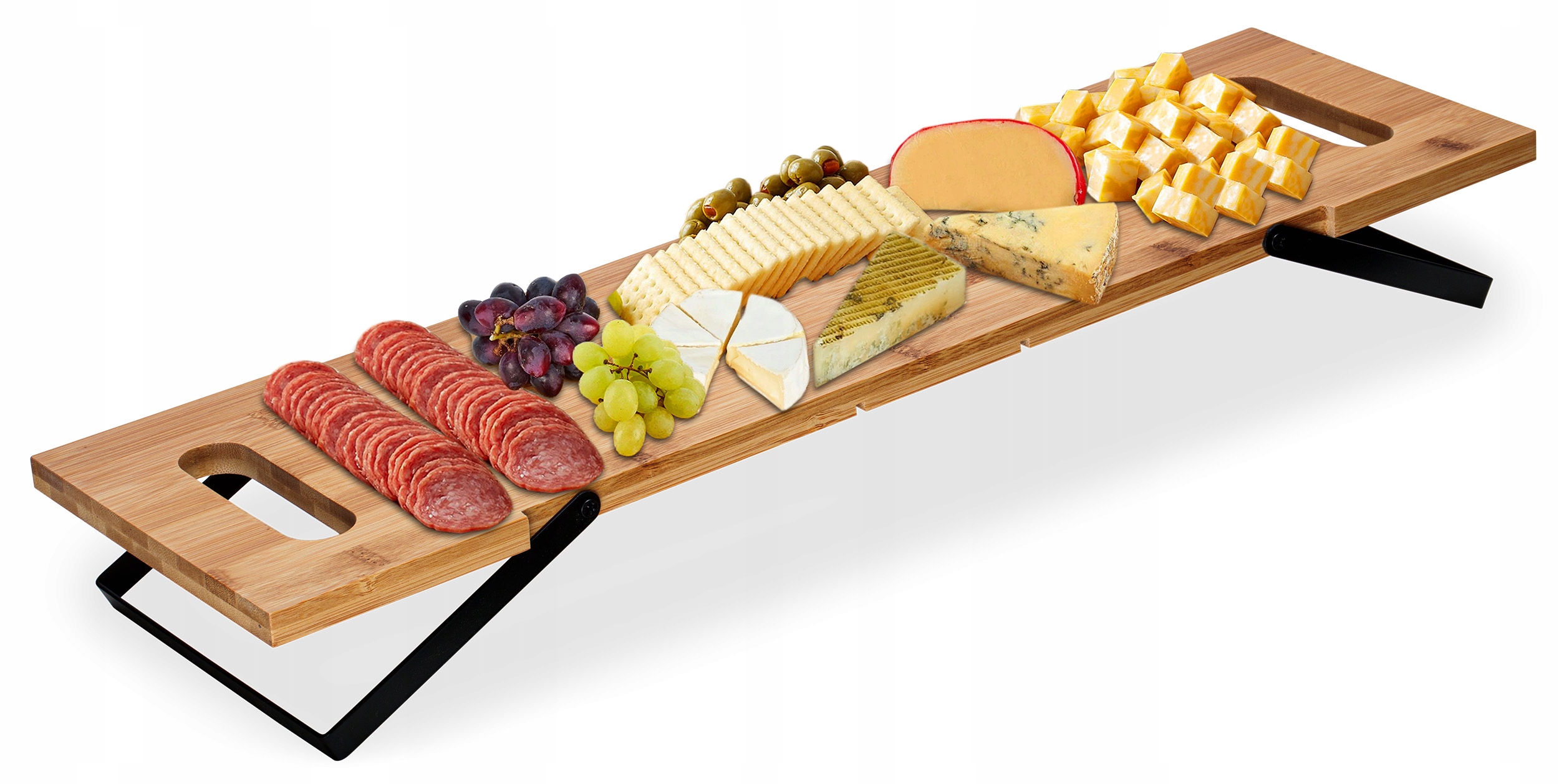 Откройте для себя сервировочную доску «Ofelia», которая является синонимом элегантности и функциональности. Изготовленная из высококачественной древесины бамбука, с выдвижными металлическими ножками модного черного цвета, эта доска станет не только практичным дополнением любой кухни, но и стильным декоративным элементом. Благодаря эргономичным ручкам переноска закусок, суши, сыра, мясного ассорти или закусок становится чрезвычайно удобной. Независимо от того, организуете ли вы семейное торжество или вечеринку для друзей, сервировочная доска «Офелия» обеспечит изысканный способ подачи любимых блюд.