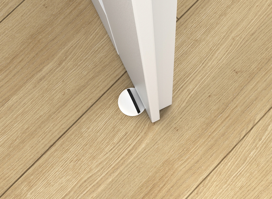 Дверной бампер в форме полусферы с резиновым элементом, поглощающим удары двери. Изготовлен из металла ZnAl (сплав цинка и алюминия) и резины. Благодаря использованию самоклеящегося слоя в нижней части бампера установка происходит быстро и легко — не требует использования инструментов. Особенно рекомендуется для помещений, в которых мы не хотим или не можем сверлить отверстия, например, с полом с подогревом.