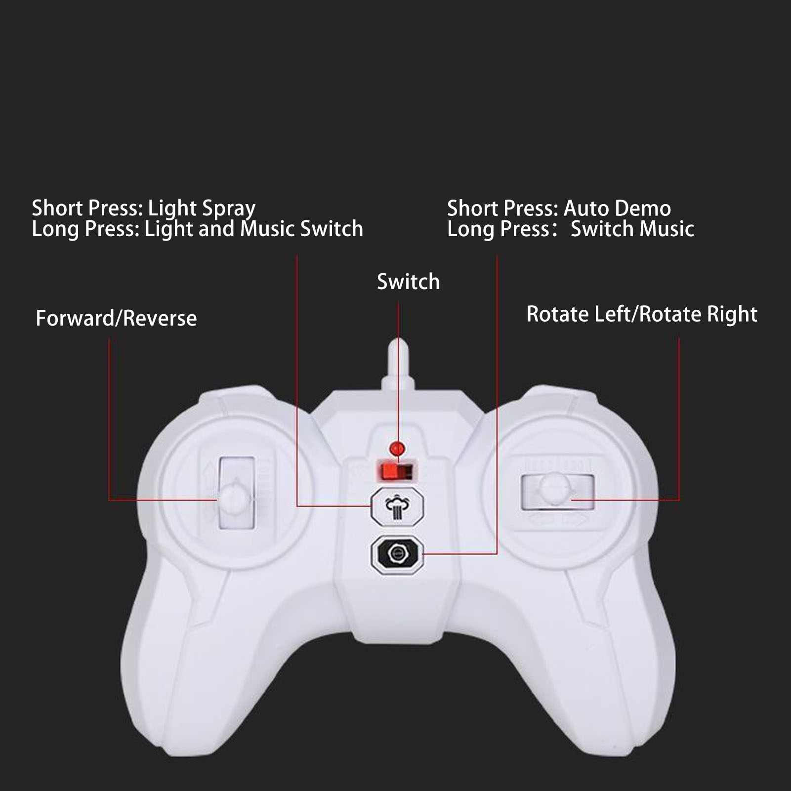 - Функции: вперед, назад, левый поворот, поворот вправо, спрей, свет, музыка, автоматическая демонстрация, бросание столкновения
