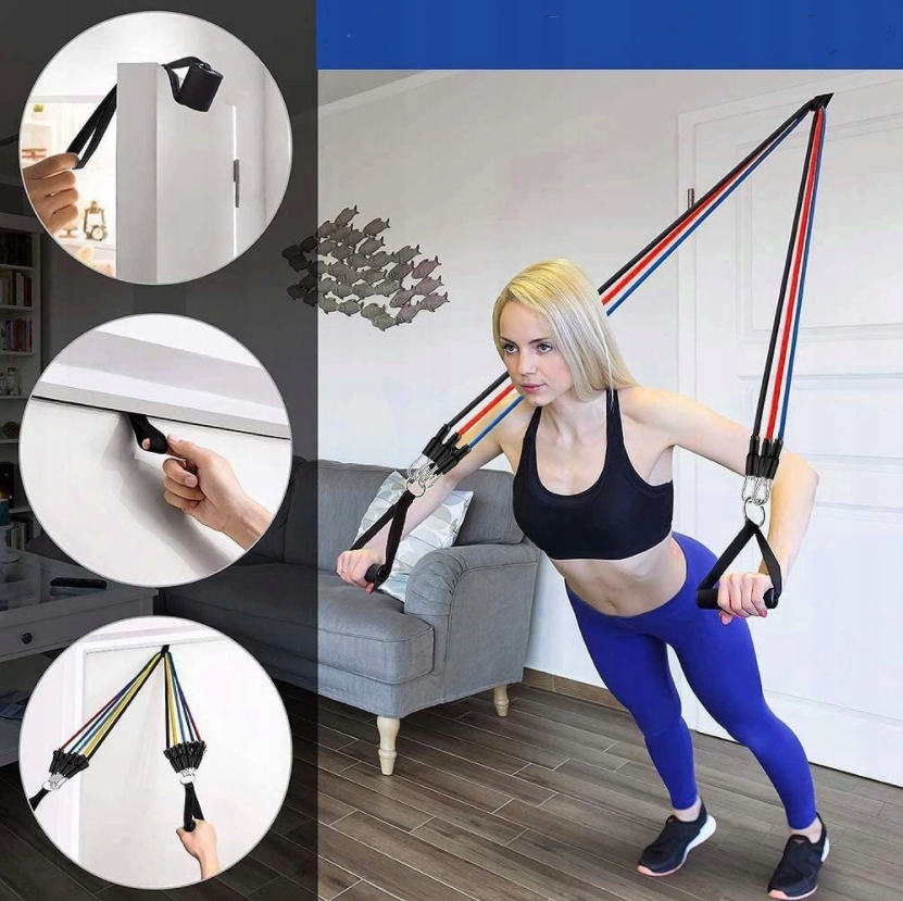 С этими эспандерами вы сможете выполнять множество физических упражнений не выходя из дома . Вы позаботитесь о каждой мышце своего тела. Специальный анкер позволяет закрепить резинки на дверце, а ремни на щиколотках позволяют тренировать нижние части мышц.