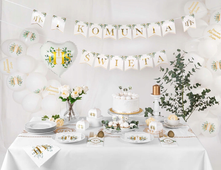 Белый и золотой – базовые цвета, которые являются неотъемлемым элементом Первого Причастия, поэтому наши украшения прекрасно впишутся в декор, дополнительно дополненные красивым мотивом с эвкалиптом, модно и эффектно.