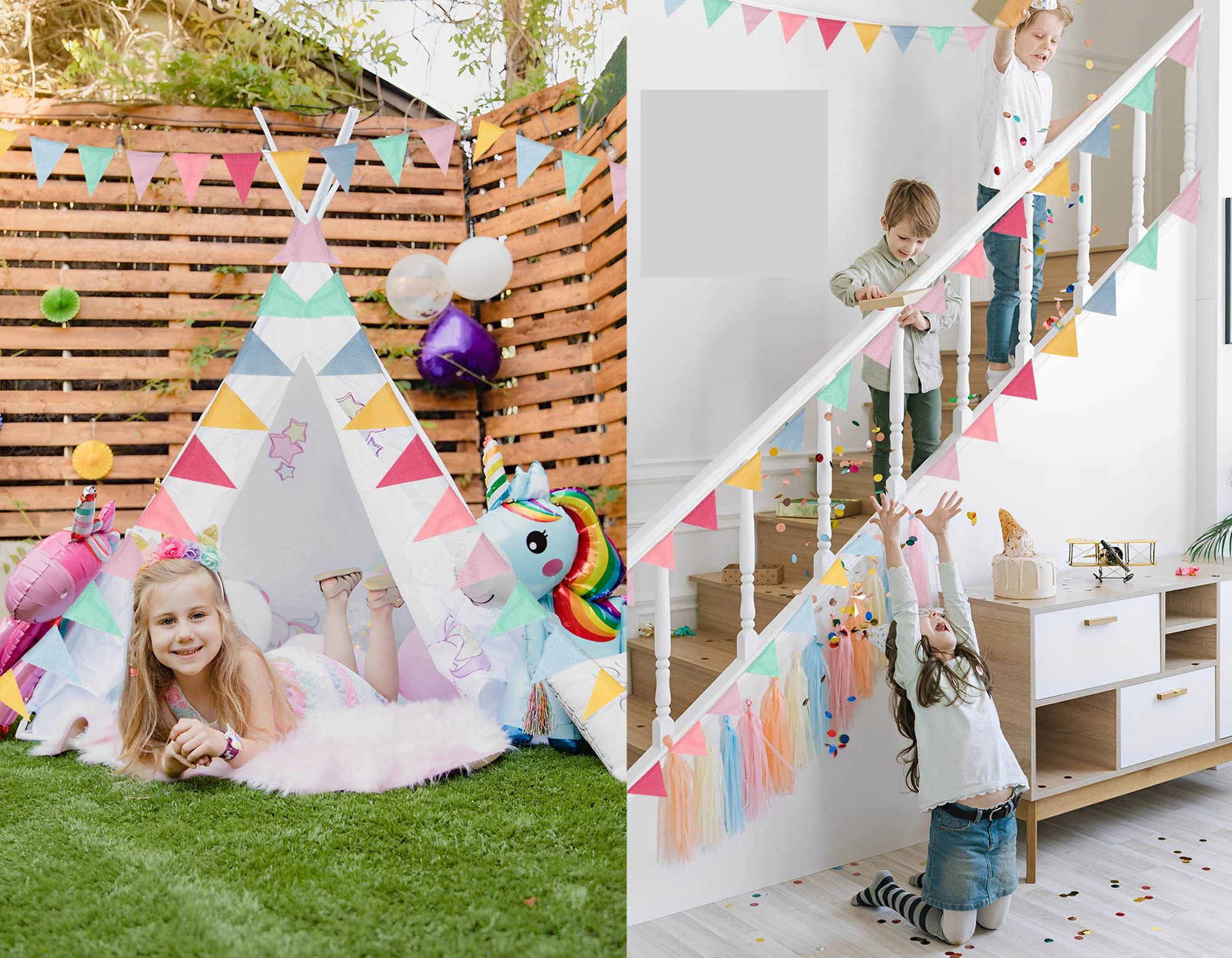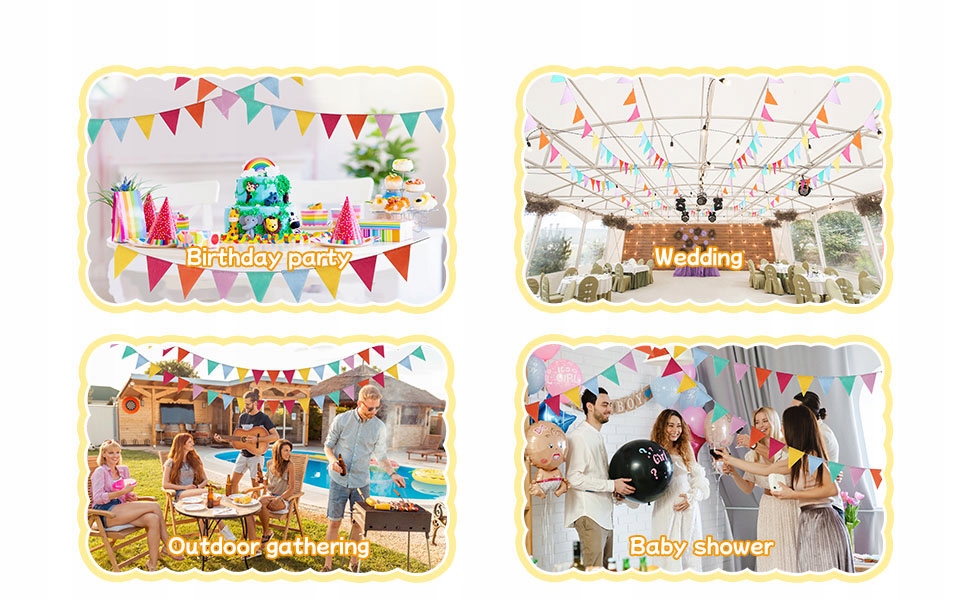 Подходит для многих случаев: Эти вымпелы будут проводиться на вечеринке-сюрпризе, вечеринке по случаю дня рождения, корпоративной вечеринке, классе, игровой комнате, детской комнате, саду, школе, вечеринке на открытом воздухе, праздничной вечеринке, пасхальной вечеринке и много других случаев. Вы также можете украсить этими вымпелами стену или потолок своего дома, а затем включить свое творение, добавив к ним гирлянды или цирковые элементы. Ваши друзья будут поражены, когда увидят их.