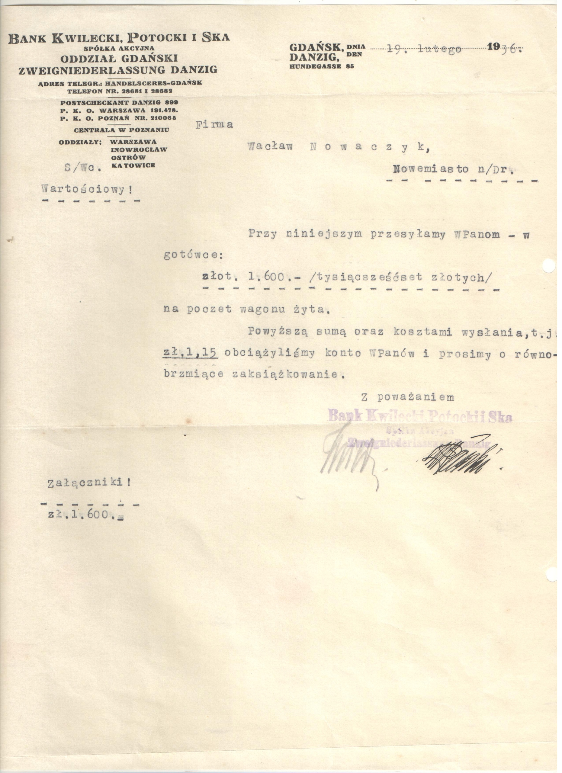 Покупая «Банк Квілецький Потоцький - відділення Вільне місто Гданськ - Гданськ лист 1936 р.» данный товар из каталога «Старые документы» вы можете быть уверены, что после оформления заказа, доставки в Украину, вы получите именно то, что заказывали, в оговоренные сроки и европейского качества.
