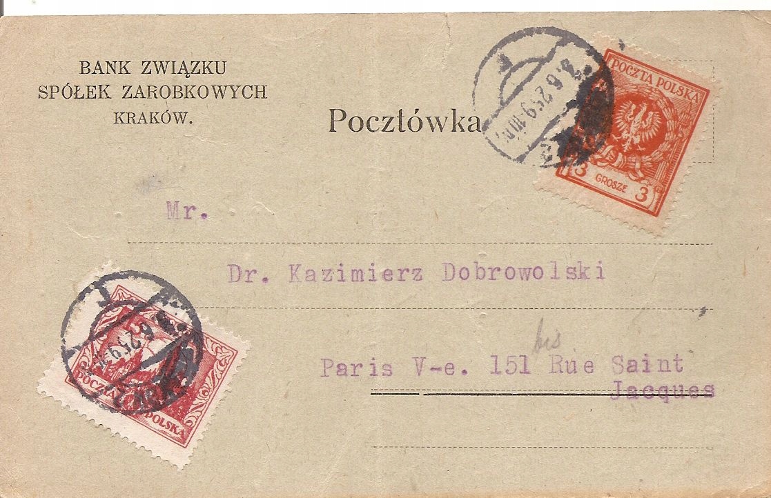 BANK ZWIĄZKU SPÓŁEK ZAROBKOWYCH KRAKÓW -karta firmowa -obieg 1925 rok Paryż