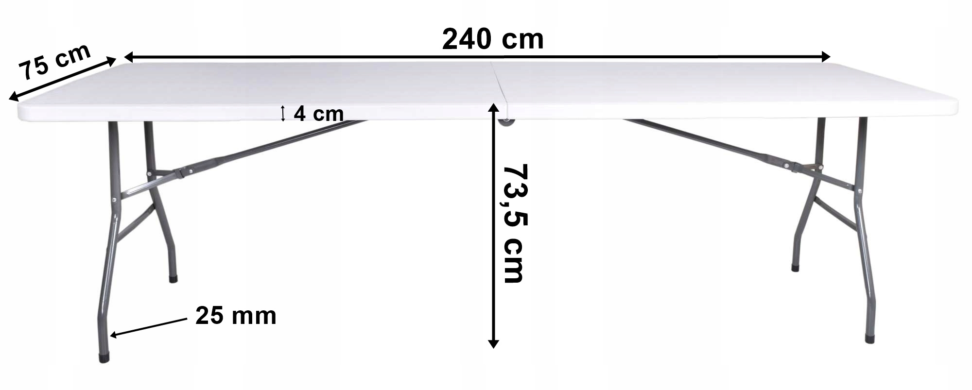 Складной стол для кемпинга и общественного питания. Очень практичный и легкий. Конструкция из стали. Столешница изготовлена из прочного пластика. В сложенном виде стол образует практичный чемодан, поэтому занимает мало места и его легко транспортировать. За столом могут разместиться до 12 человек.