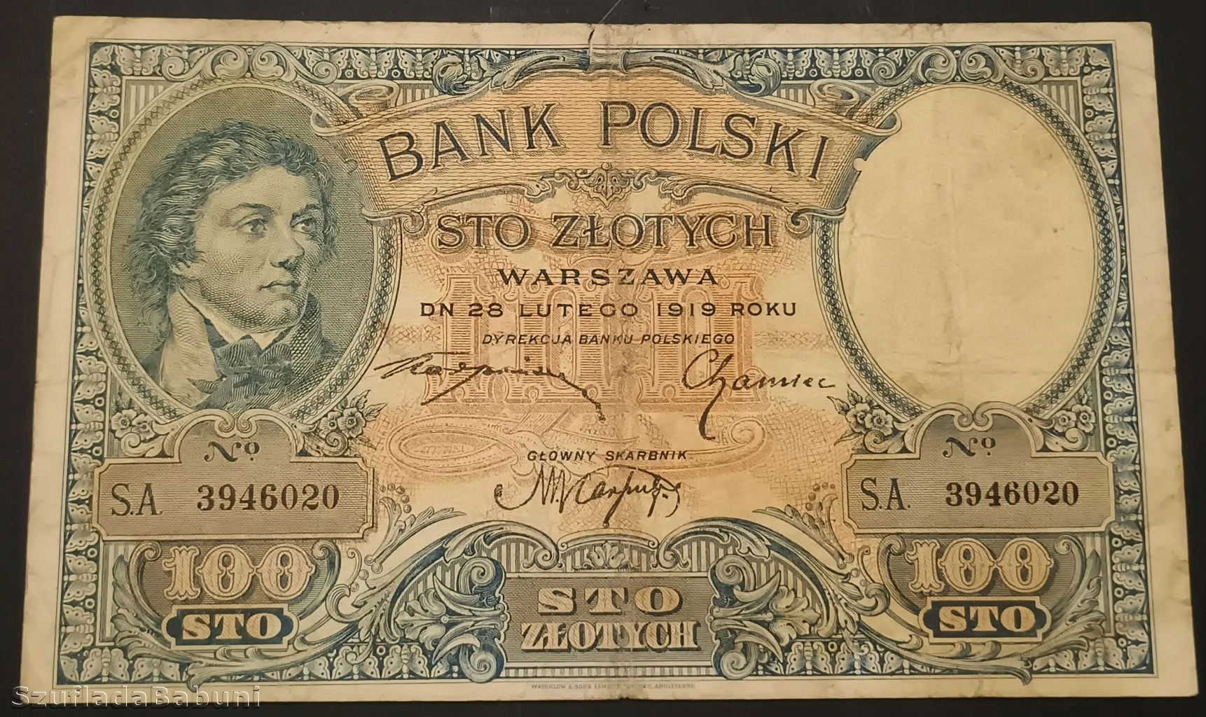 Банкнота номиналом 100 злотых 1919 года серии S.A.