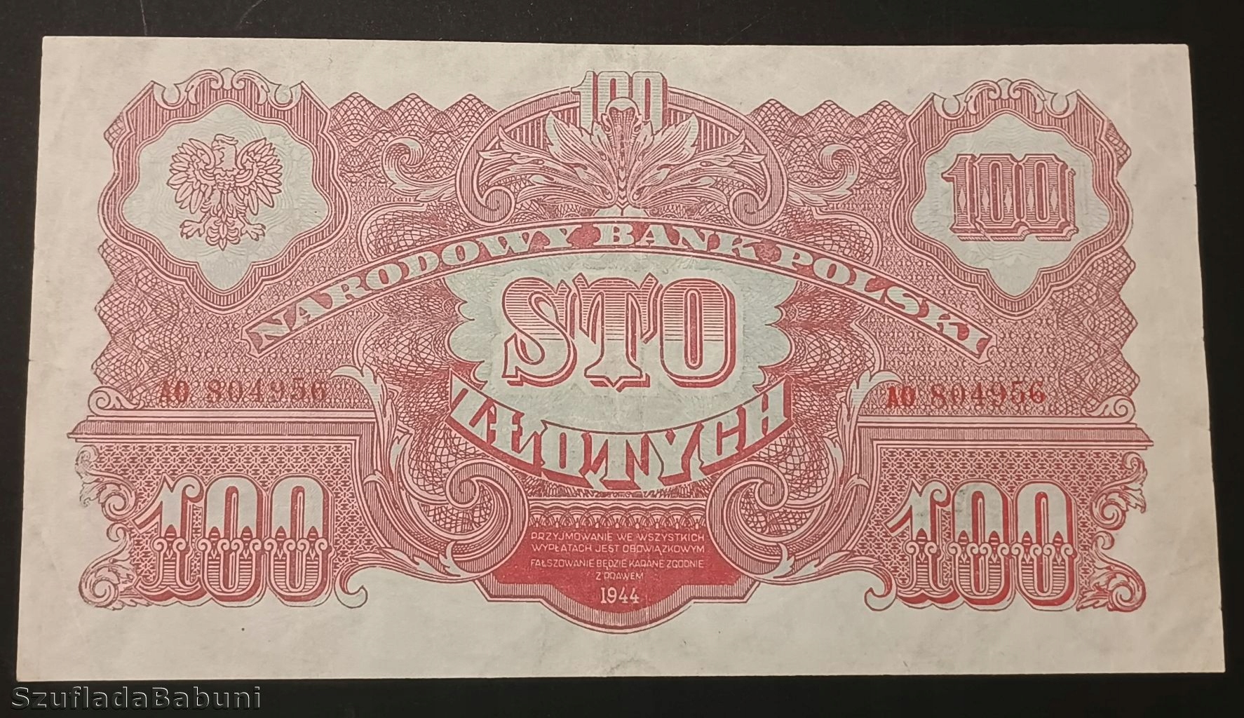 Банкнота номиналом 100 злотых 1944 года серии АО.