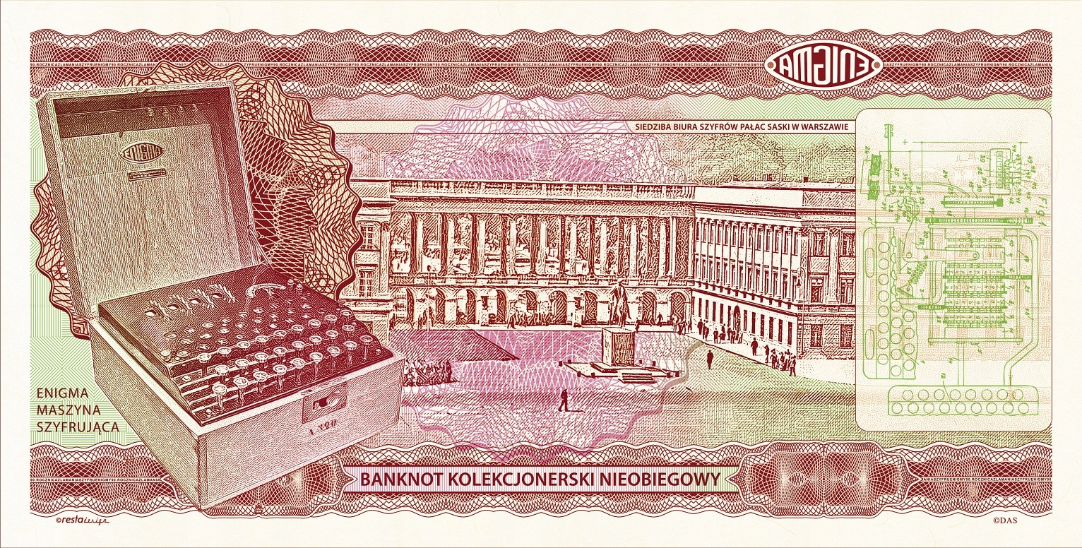 Обратная сторона: Гильошированный фон, полутоновый орнамент; Вверху логотип Enigma в зеркальном отражении — элемент реверс-реверс; Внизу есть пункт: НЕОБРАЖЕННАЯ КОЛЛЕКЦИОННАЯ БАНКНОТА; Внизу, на полях, слева отметка автора: © restadesign, справа клеймо типографии: © DAS; В центре изображение штаб-квартиры Шифровального бюро в Саксонском дворце в Варшаве с надписью: РАСПОЛОЖЕНИЕ ОФИСА CYFR, САССКИЙ ДВОРЕЦ В ВАРШАВЕ. Слева изображение оригинальной шифровальной машины «Энигма», одной из нескольких версий, вероятно, «Энигма D» (коммерческая), с надписью: ЭНИГМА / МАШИНА / ШИФРОВАНИЕ. Слева схема устройства из патента 1928 года; В верхней части и в нижней части слева и справа микротексты «90-летие взлома кода FRUENIGMA»