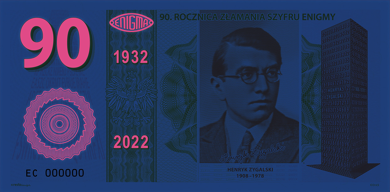 Лицевая сторона: гильошированный фон, напоминающий старые польские банкноты; Слева находится отдельное поле с фоном, заполненным кодовыми буквами, образующими передающую антенну с распространяющимися волнами. Вверху номинал «90» заполнен повторяющейся юбилейной цифрой «90». Внизу серия и цифра черного цвета с одинаковым размером шрифта, две буквы и шесть цифр; На правой стороне отдельная полоска с орнаментом, сверху логотип Enigma — элемент реверс-версо. В центре – орел с герба Польши. Вверху и внизу орла юбилейные годы: 1932/2022. По краю полосы микропринты «90th ANNIVERSARY OF THE FRUENIGMY CYBER»; Справа, возле верхнего края, памятная надпись: 90. ГОДОВЩИНА ВЗЛОМА КОДА ЭНИГМЫ. В центре отдельная полоса с фотографией, факсимиле и годами жизни Мариана Раевского, Генрика Зигальского и Ежи Ружицкого. Имя/год на фоне волнистых линий и кодовых букв. По более длинным краям микропринты «90-летие взлома кода FRUENIGMA»; Справа — памятник криптологам в Познани; Между памятником и фотографией, в нижней части, инициалы автора; Внизу, на полях, слева клеймо автора: © restadesign, справа клеймо типографии: © DAS