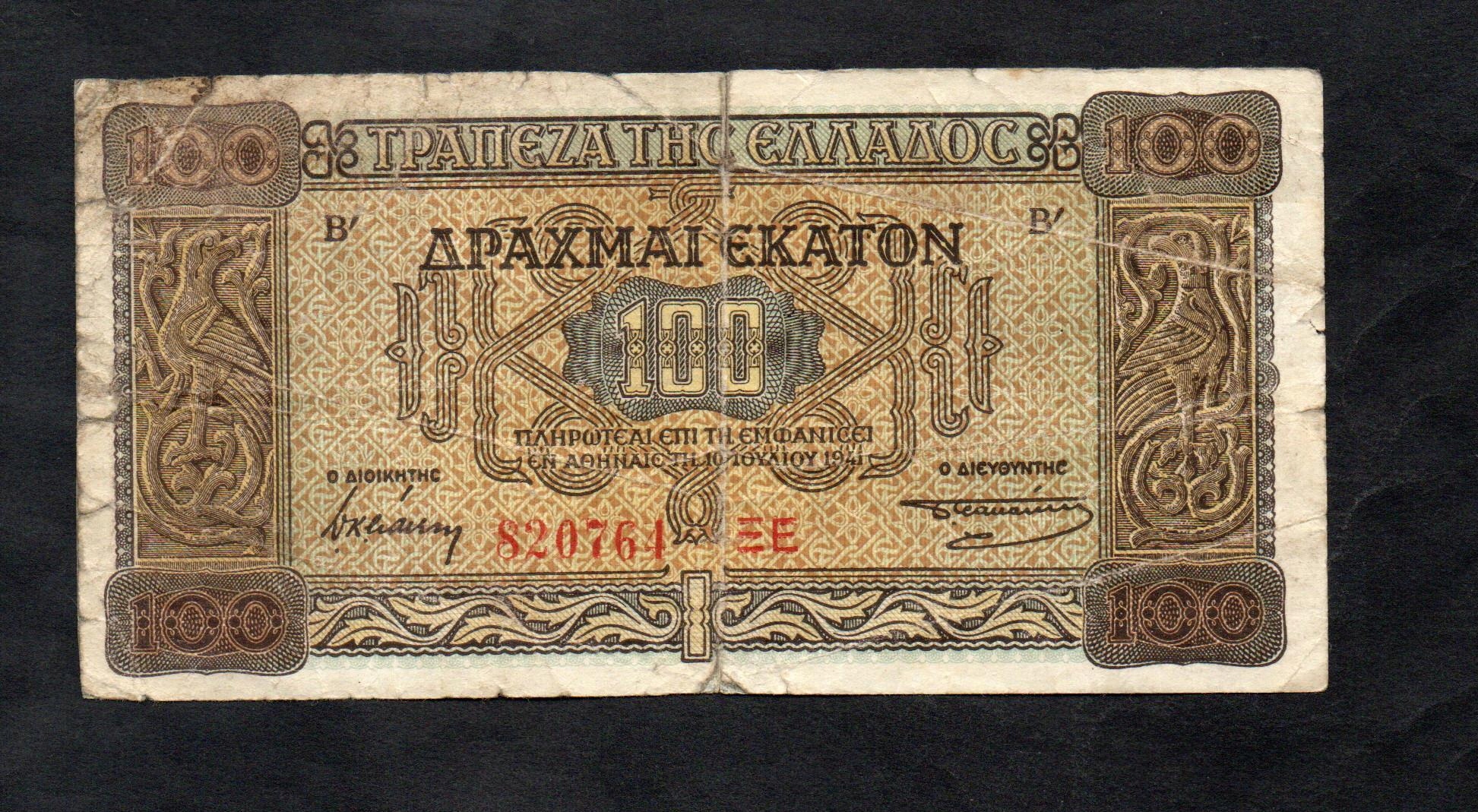 БАНКНОТА ГРЕЦІЇ -- 100 ДРАХМ -- 1941