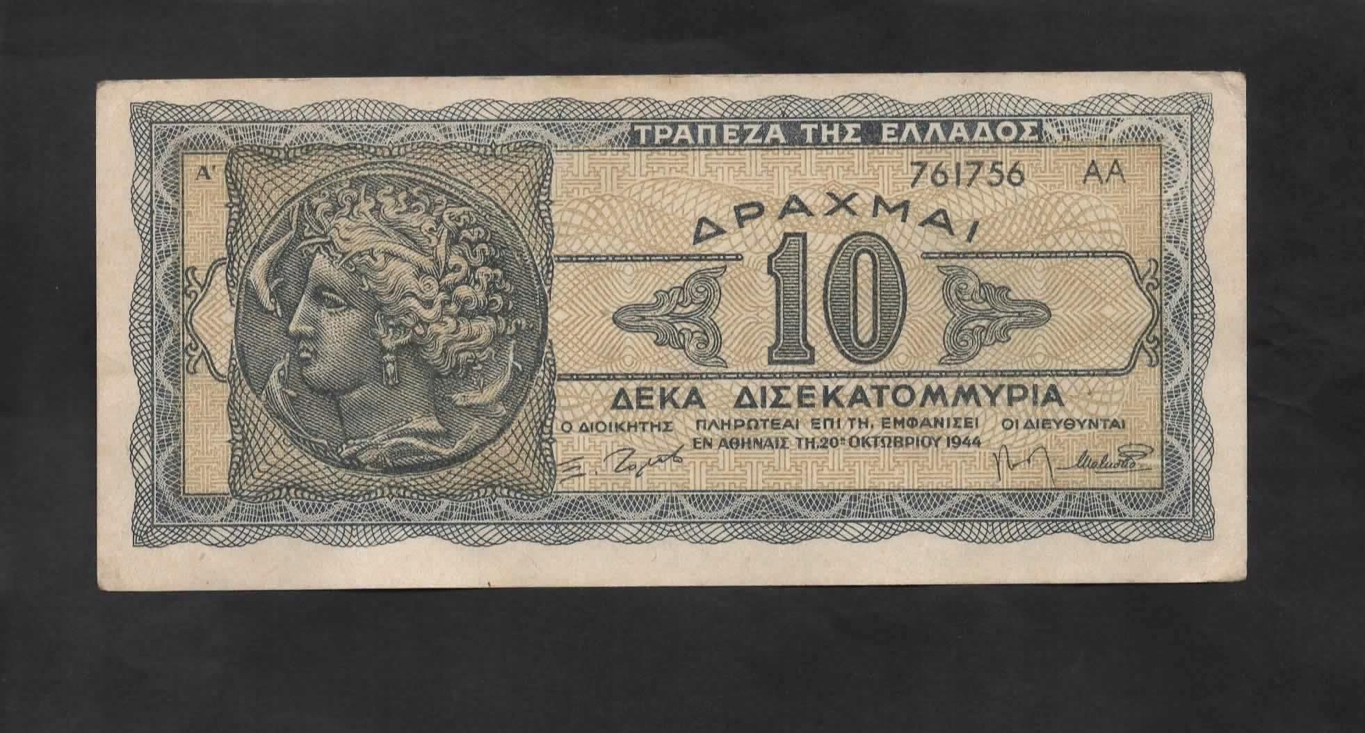 БАНКНОТА ГРЕЦІЯ -- 10 ДРАХМ -- 1944 рік