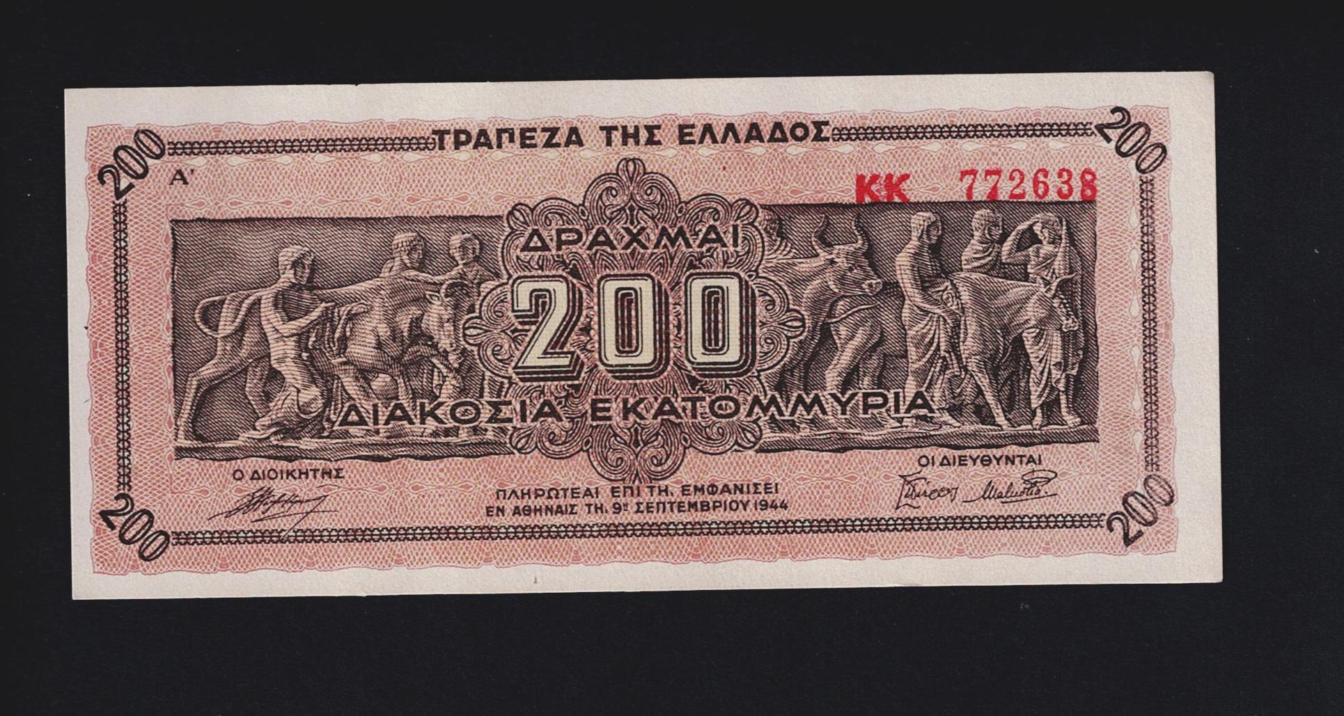 БАНКНОТА ГРЕЦИИ 200000000 ДРАХМ 1944 ГОДА