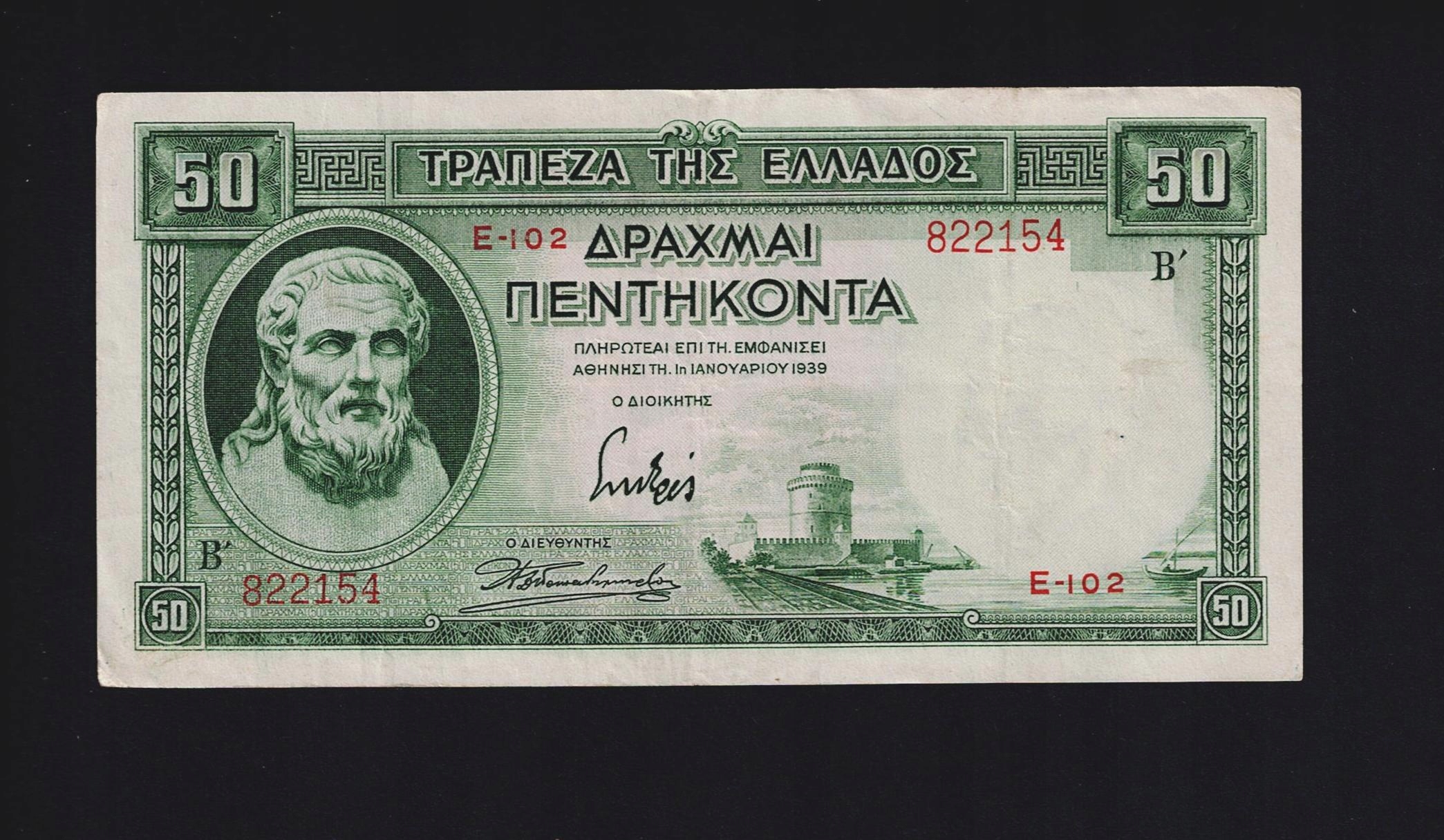 БАНКНОТА ГРЕЦІЯ -- 50 ДРАХМ -- 1939 рік