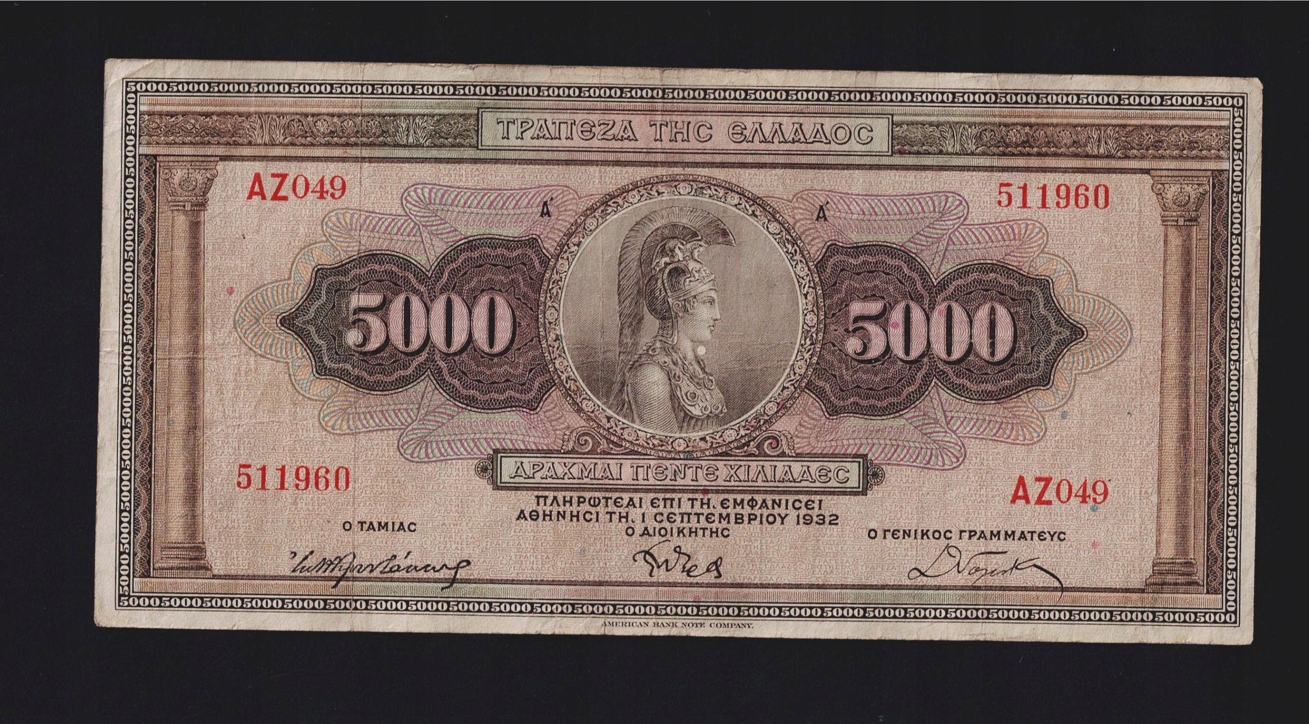 БАНКНОТА ГРЕЦІЯ -- 5000 ДРАХМ -- 1932 рік