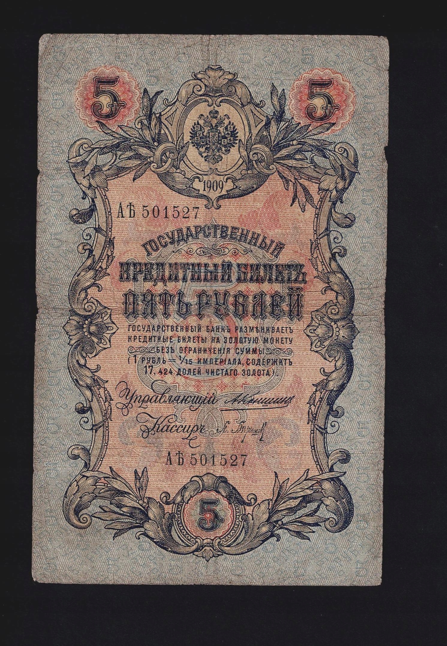БАНКНОТА РОССИИ -- 5 рублей -- 1909 г., КОНШИН - БАРЫШЕВ