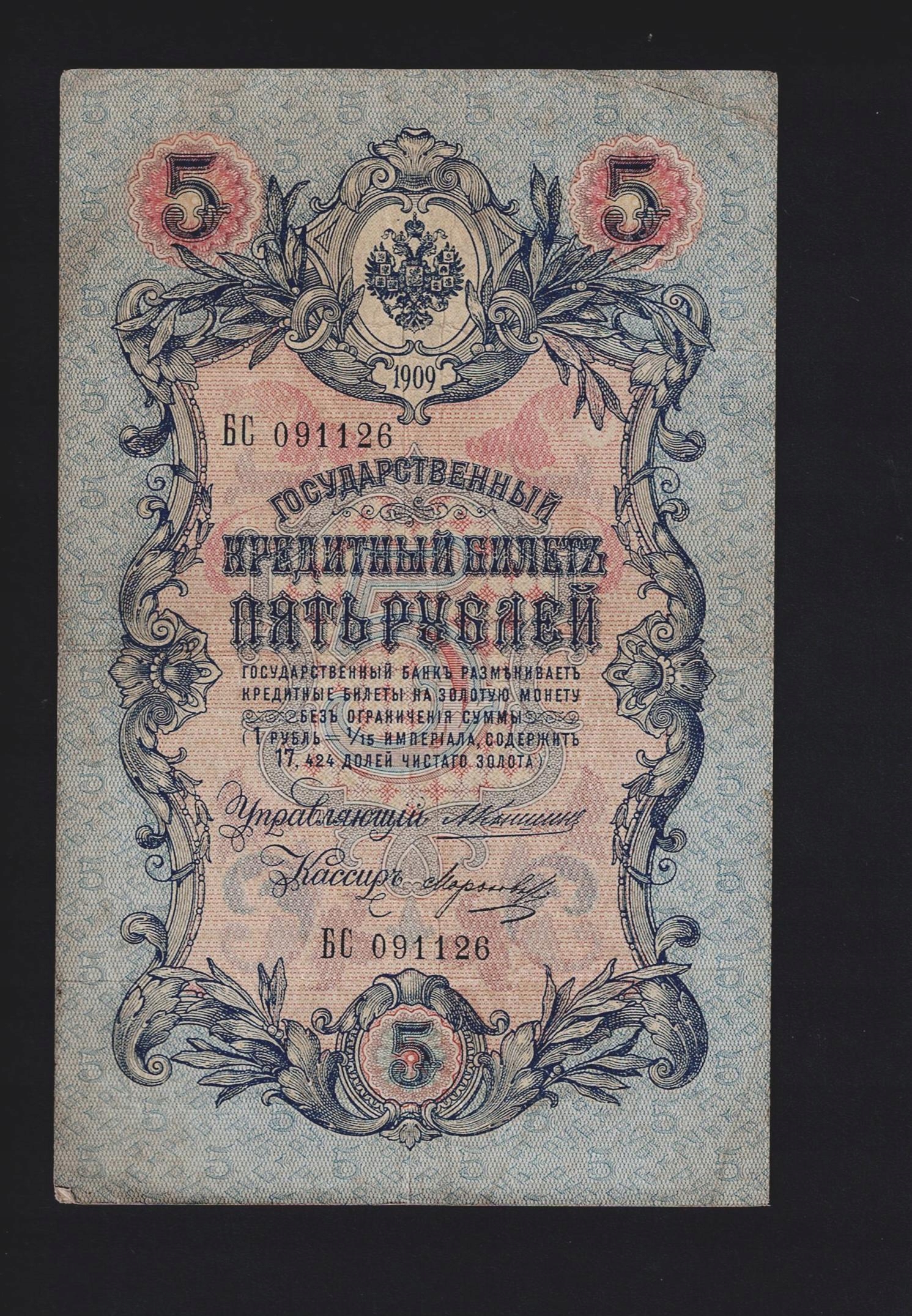 БАНКНОТА РОССИИ -- 5 рублей -- 1909 г., КОНШИН - МОРОЗОВ