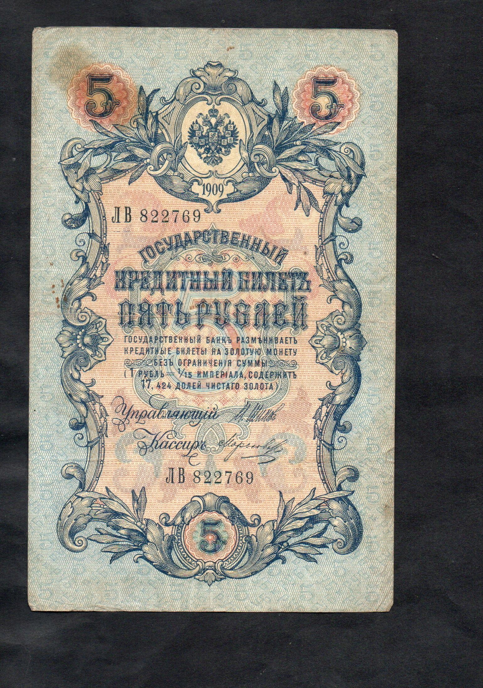 БАНКНОТА РОСІЇ -- 5 рублів -- 1909, ШИПОВ-МОРОЗОВ