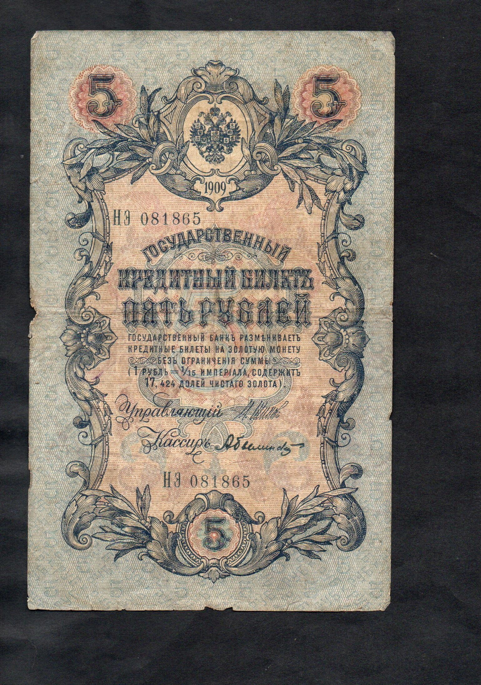 БАНКНОТА РОСІЇ -- 5 рублів -- 1909, SHIPOW - BYLIŃSKI