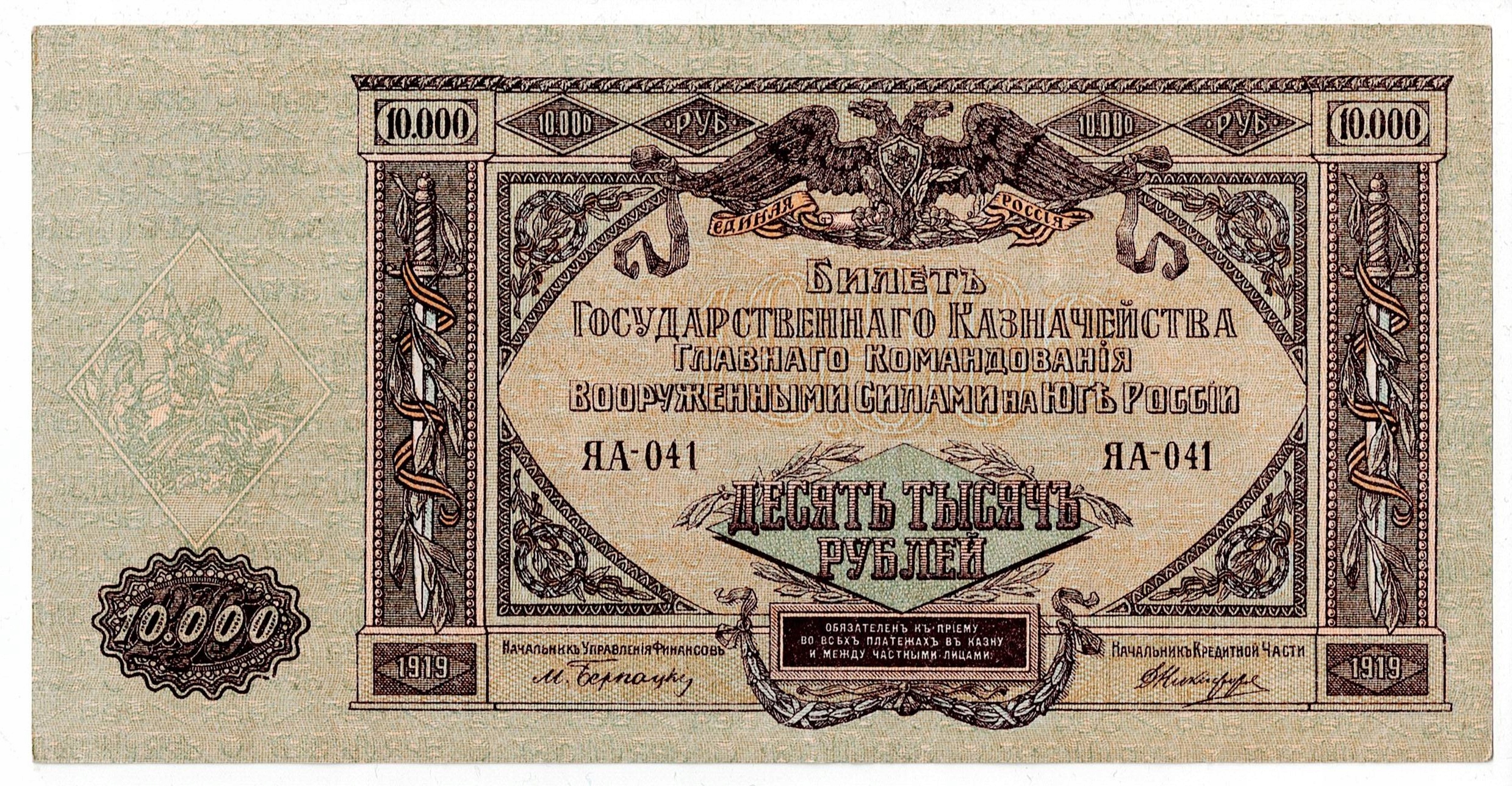 Описание: Банкнота, Россия 10 000 рублей 1919 года СЗПР (Вооруженные силы юга России)