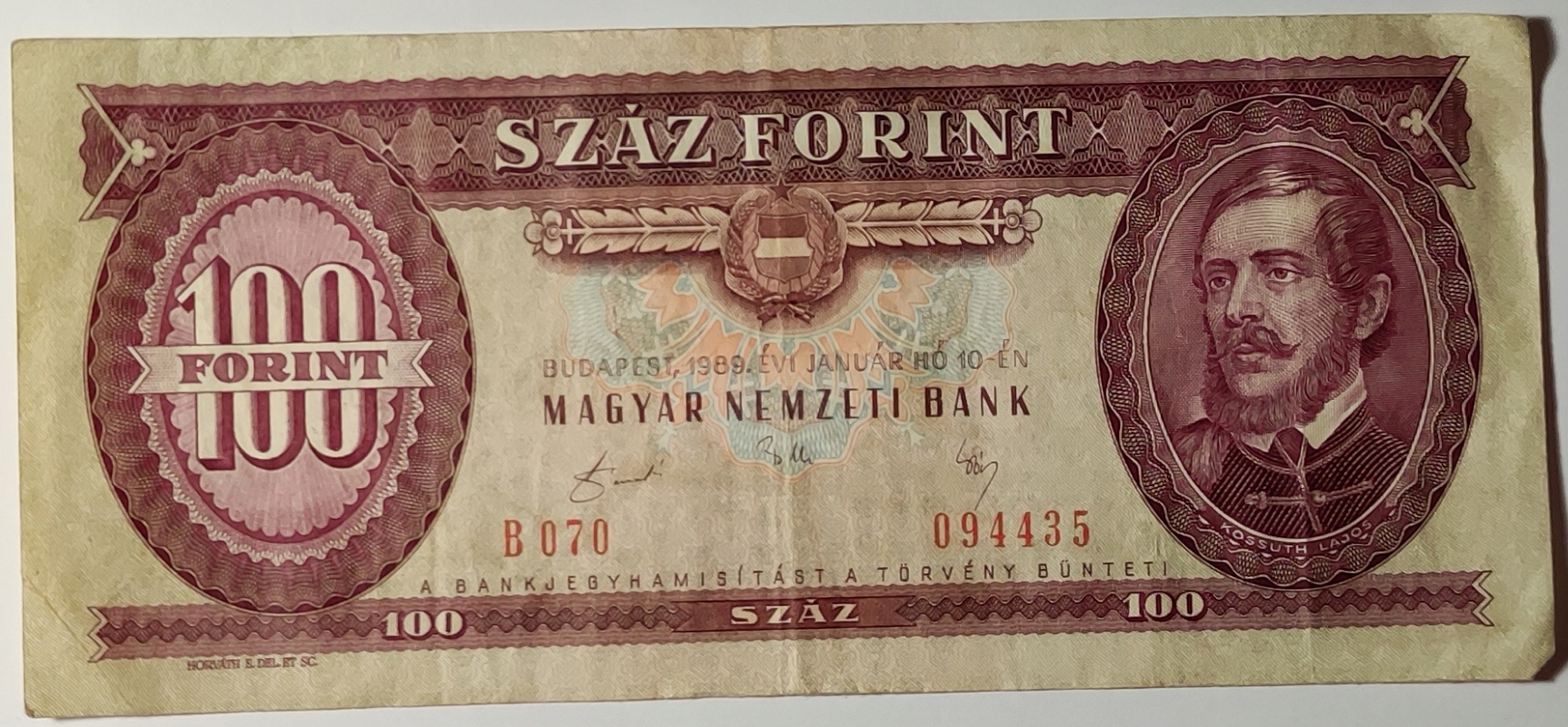 Банкнота 100 форинтов Венгрии 1989 года, серия B 070 форинтов