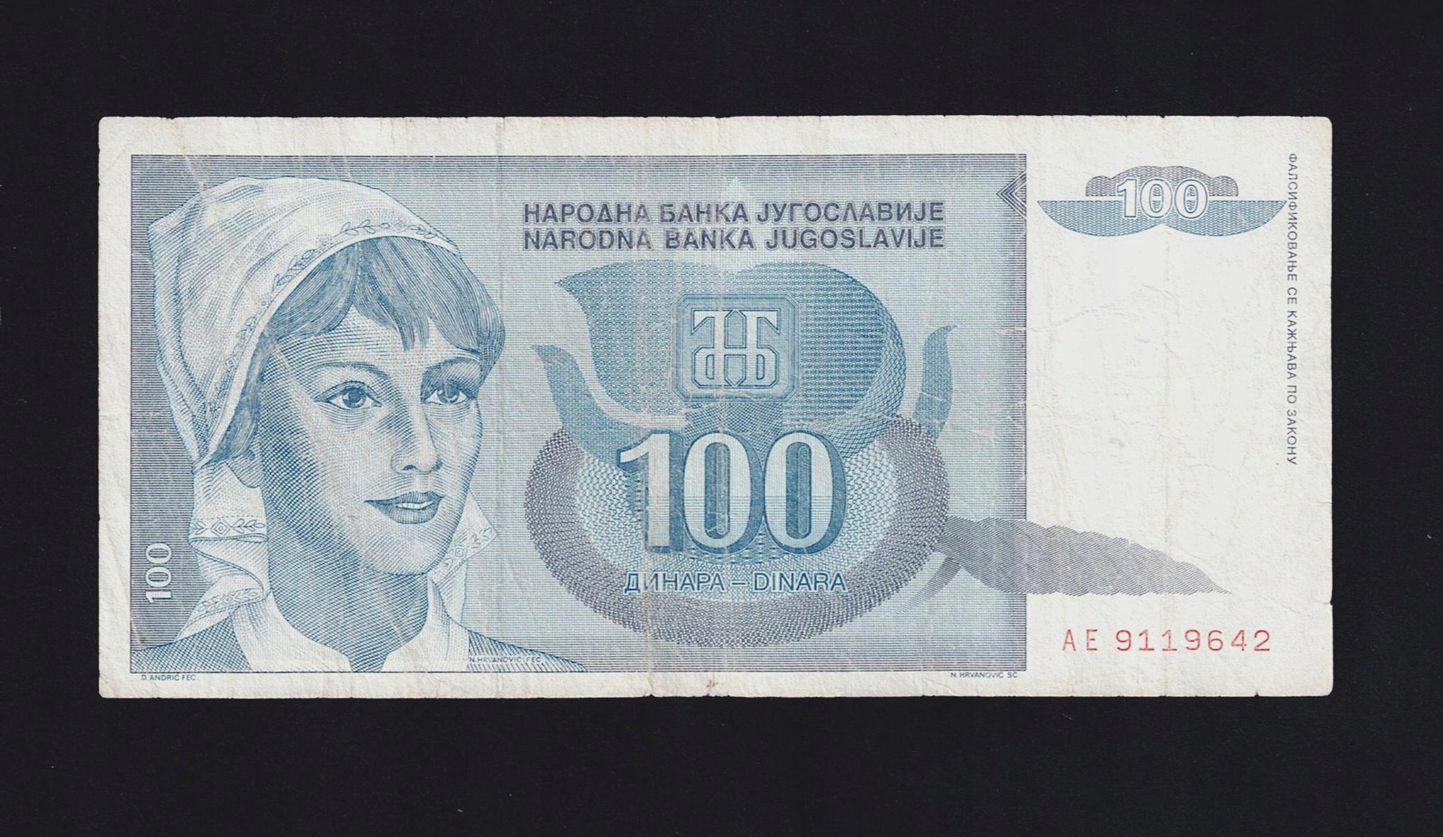БАНКНОТА ЮГОСЛАВИИ - 100 ДИНАРОВ - 1992 г.
