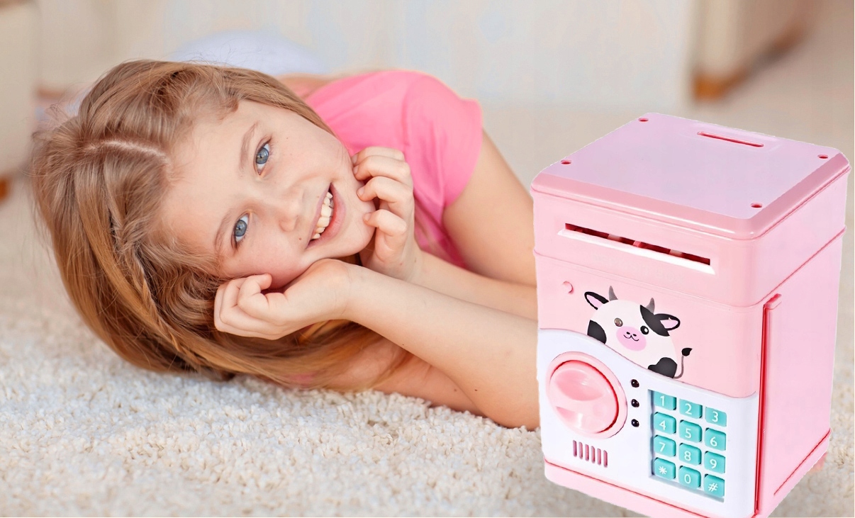 Предлагаем розовую копилку в виде сейфа с электронным кодом! Благодаря этому ваш ребенок научится экономить и планировать расходы. Копилка автоматически принимает бумажные деньги и монеты. Просто приложите банкноту к прорези, и сейф автоматически заберет деньги! После его скачивания начнет играть одна из 7 мелодий. Сейф открывается после ввода четырехзначного кода — значение по умолчанию: 0000. Код можно свободно изменить, как описано ниже.