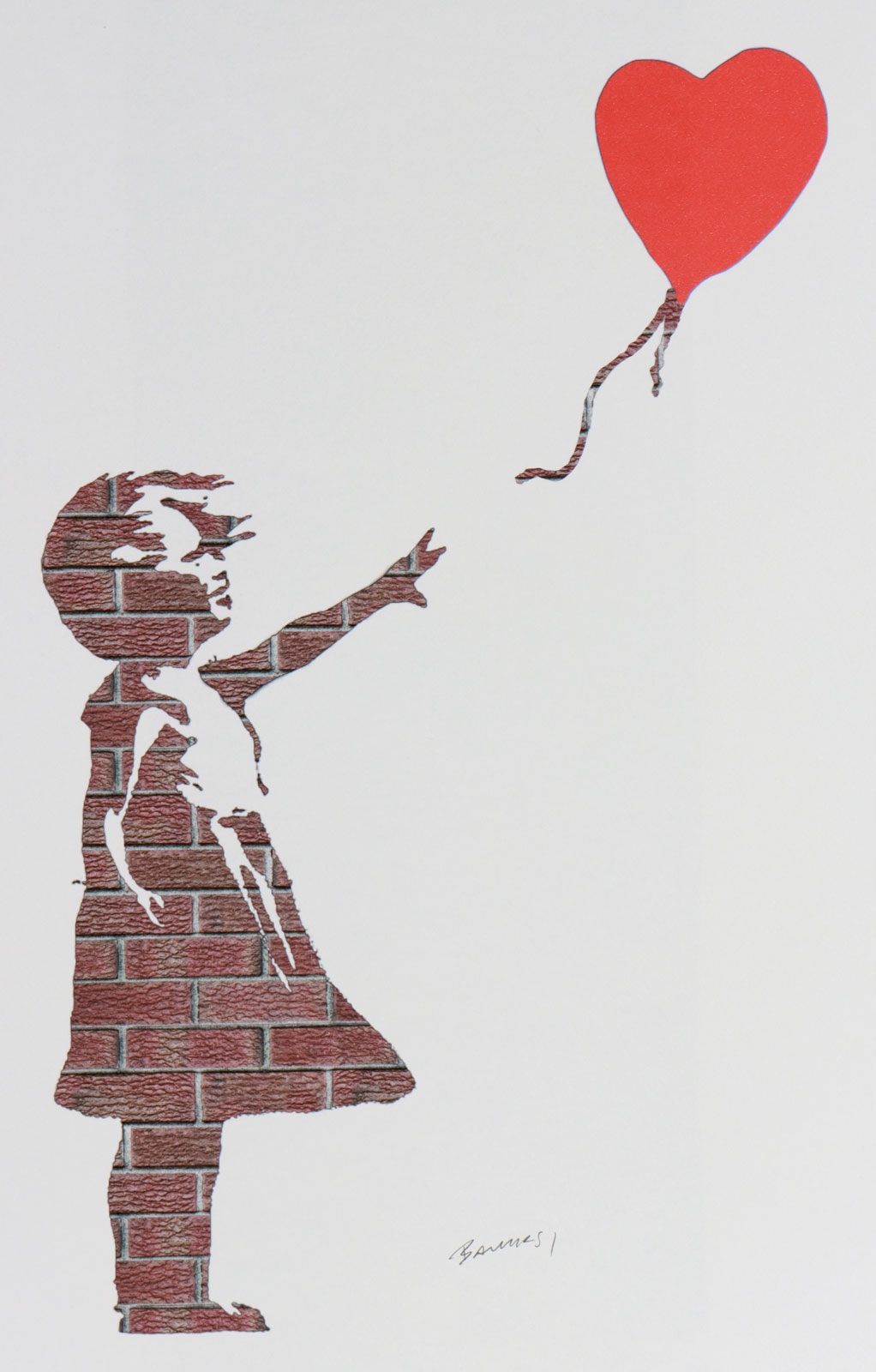 Графика, изображающая стоящую девушку, которая сбежала из красного воздушного шара в форме сердца. Бэнкси , родился на Йейте) - Британское уличное художник. Его работы появляются на улицах Лондона и в других местах по всему миру. Бэнкси использует различные методы для передачи своих сообщений, чаще всего юмористических или связанных с политикой. Его первоначальная форма уличного искусства, сочетающая граффити и характерную технику шаблона, а также смелое и часто очень рискованное место работы, приобрела признание художников и был замечен средствами массовой информации.