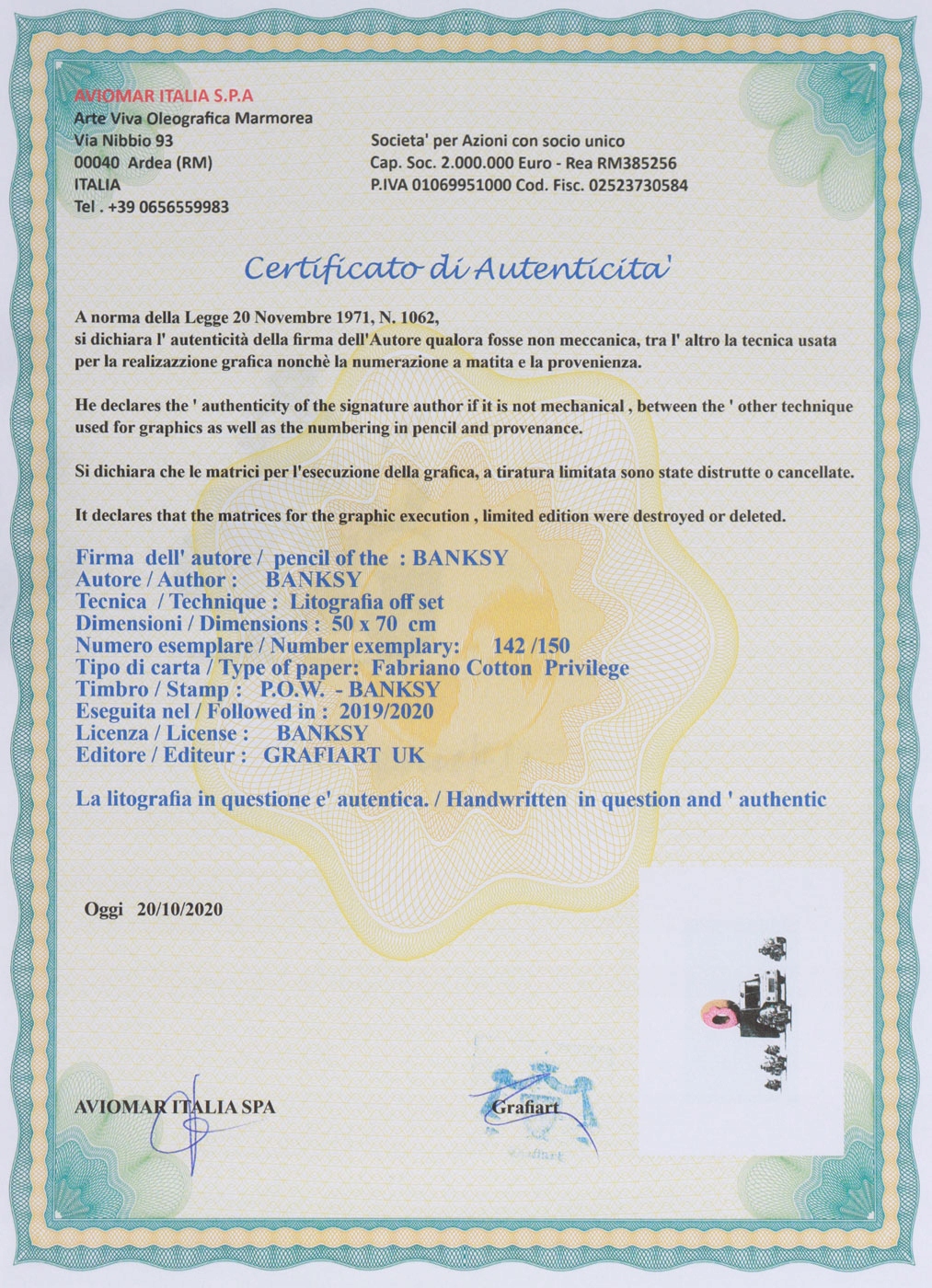 Техника: литография / бумага. Работа подписана в правом нижнем углу. Карандашная циркуляция: 142/150. Aviomar Italia S.P.A Сертификат включен в работу.
