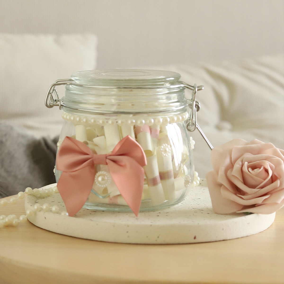 Очаровательная стеклянная банка с рельефным сердцем, украшенная вручную атласным бантом персиково-розового оттенка и тонкими бусинами.