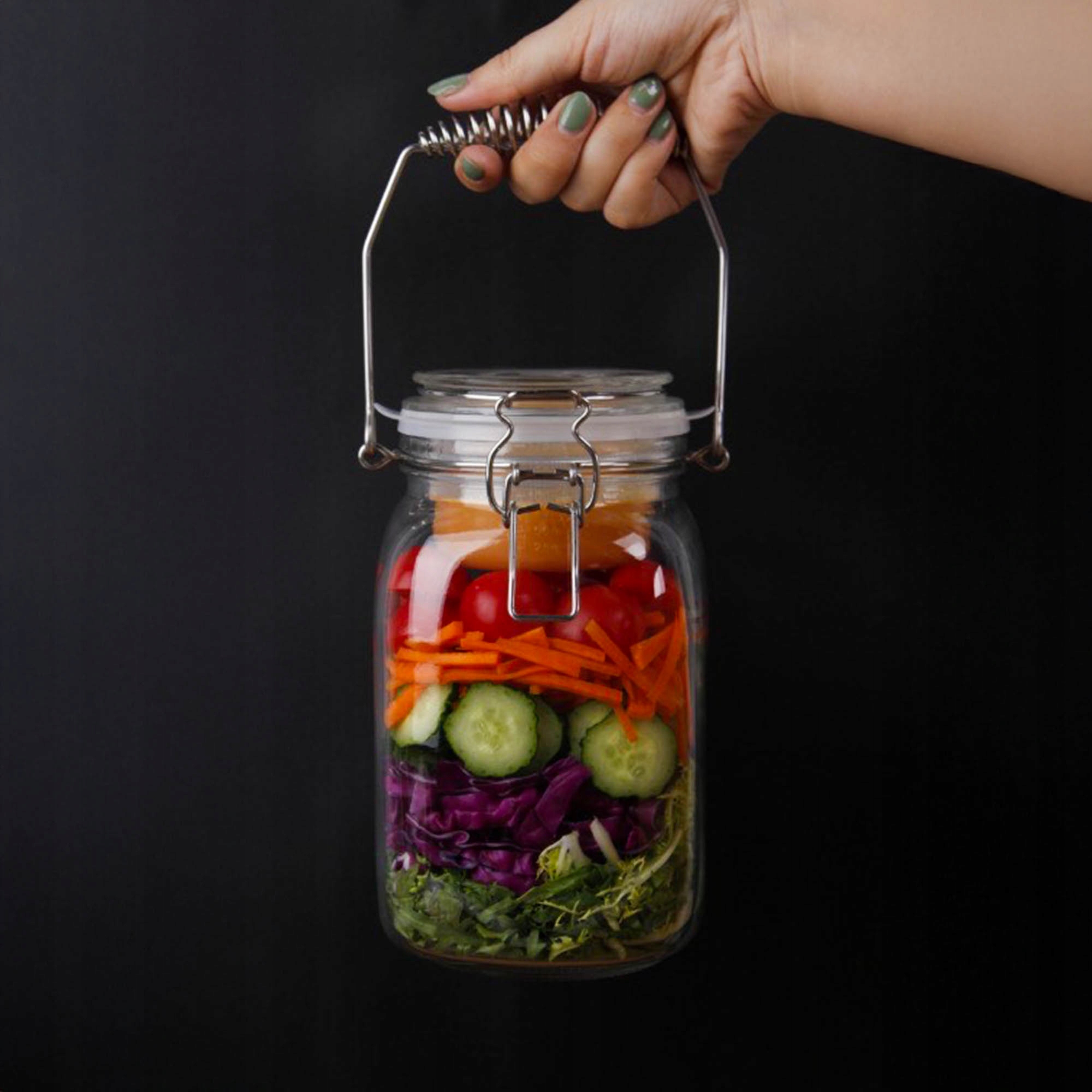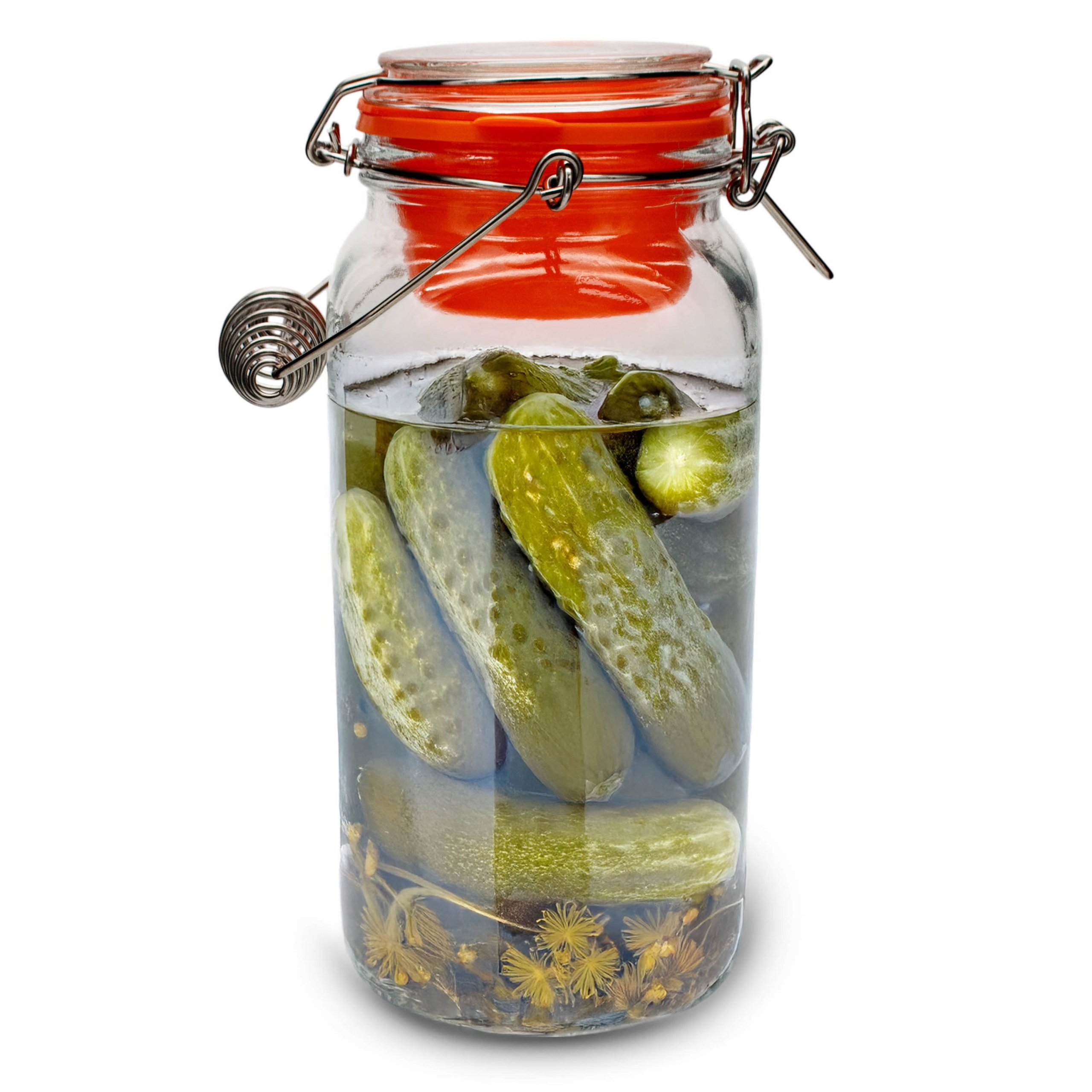 Практическая и прочная стеклянная банка с герметичной застежкой и гибким оранжевым внутренним давлением. Пластическое давление удерживает содержимое – например, огурцы, капуста или другие овощи – под поверхность рассола, что обеспечивает безопасные условия брожения и хранения без риска порчи продукта. Он также может выполнять функцию чашки.