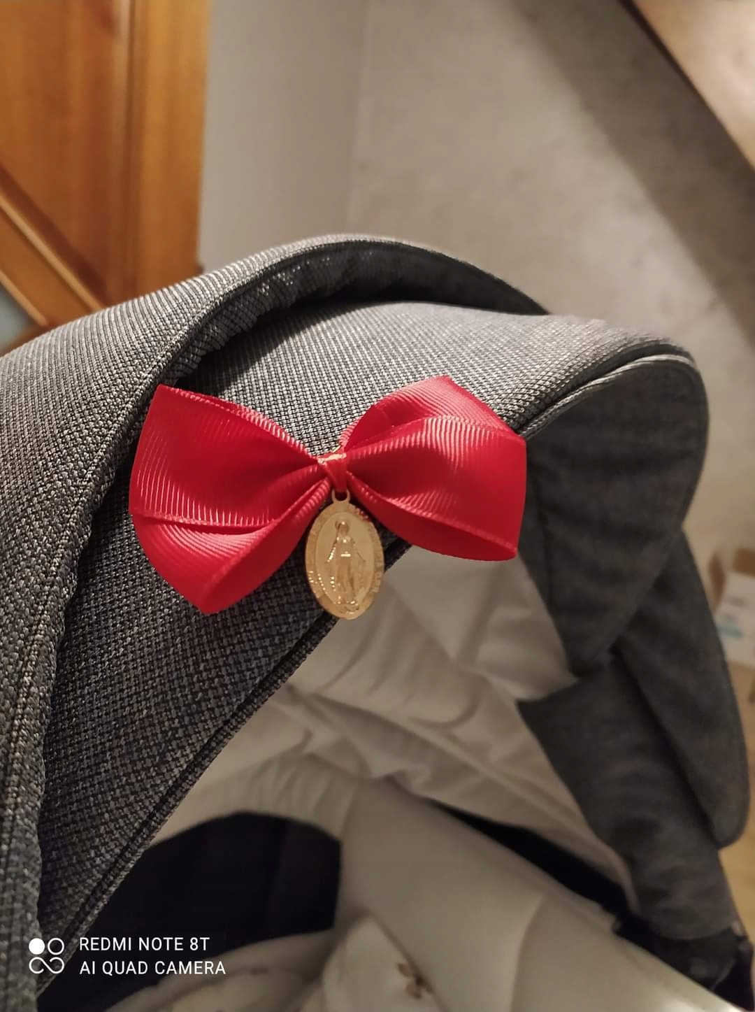 бант на коляску червоний, бант з Богородицею, колір срібло, шпилька