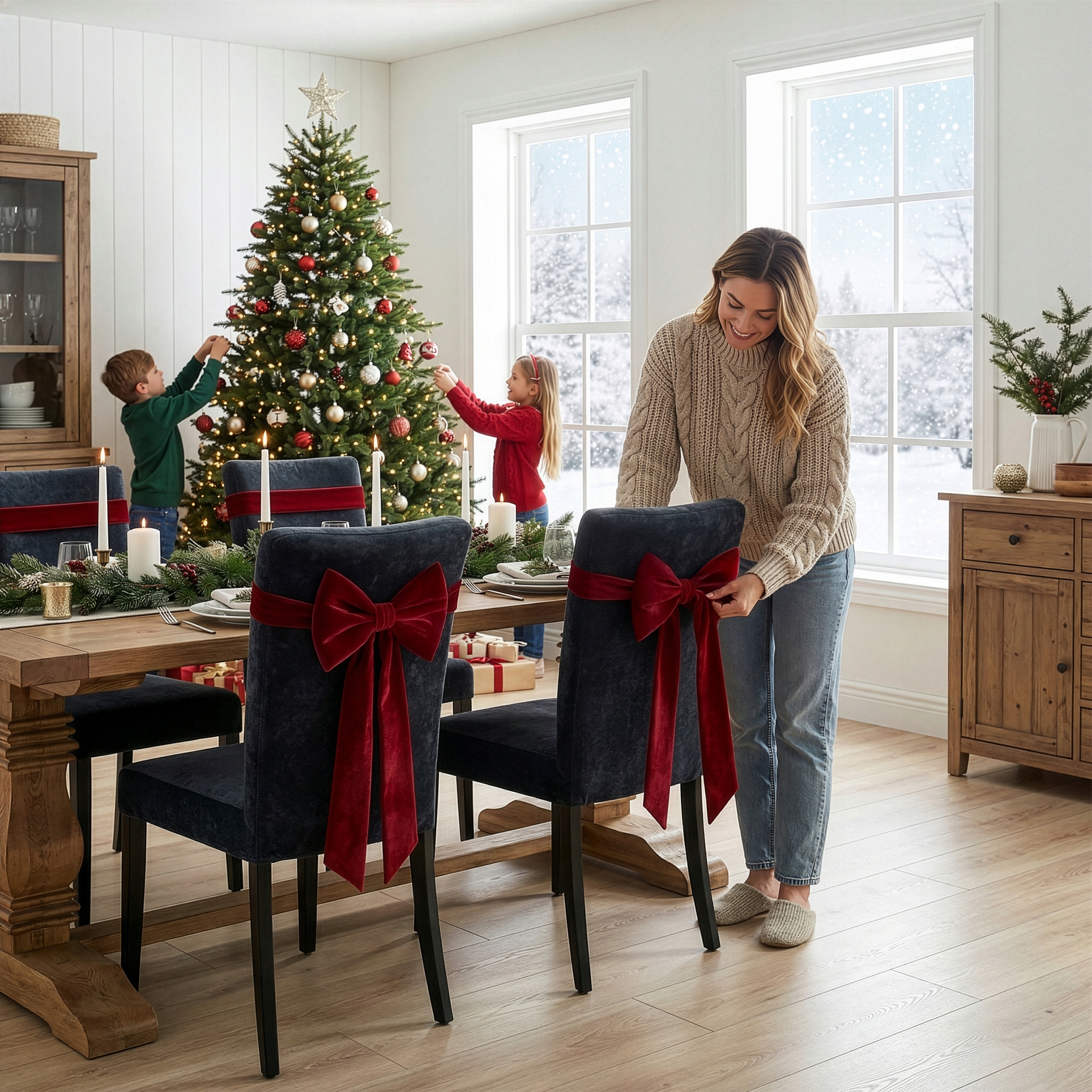 Добавьте немного волшебства на ваш рождественский стол. Мягкий бордовый бархатный бант придаст каждому стулу роскошный, праздничный характер – а ваши гости будут в восторге от деталей, создающих прекраснейшую рождественскую атмосферу.